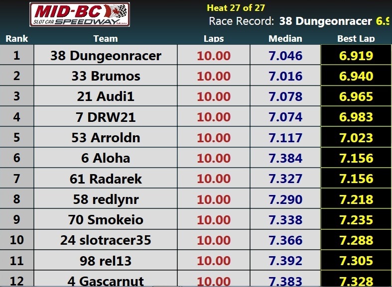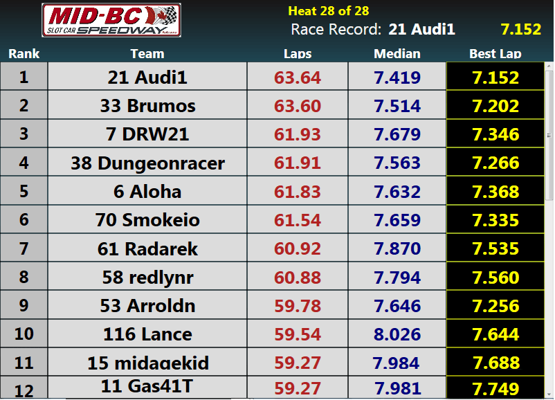Congratulations to local racer Randy……his #3 Ford GT40 finishing 14th. What’s fantastic about Randy’s finish is his Ford is a Scalextric body which is quite a bit narrower and heavier than most of the other cars in this event. Well done Randy!