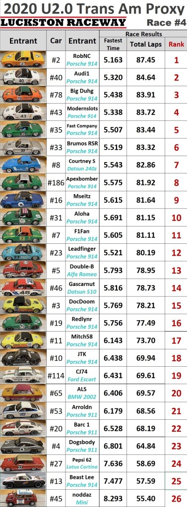 The TransAm cars continued in Kelowna and ran Race #4 at the new Luckston Raceway which was recently built in the summer of 2020. The SRC Porsche 914’s continued their domination with the same podium result as the previous race at MID-BC. Congratulations to 1st RobNC, 2nd Audi1, and 3rd Big Duhg for the repeat podium finish.