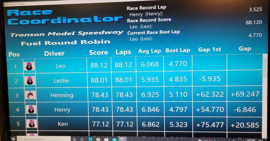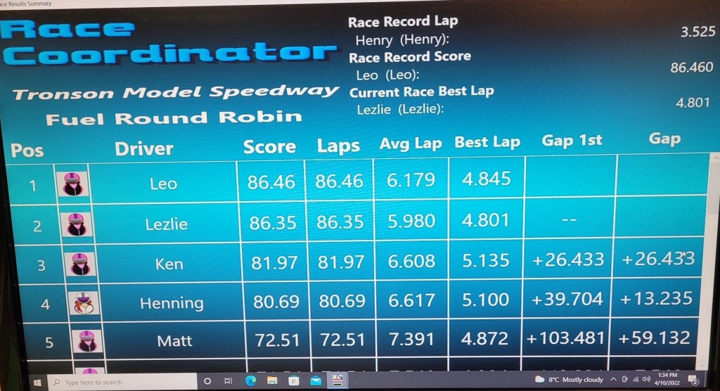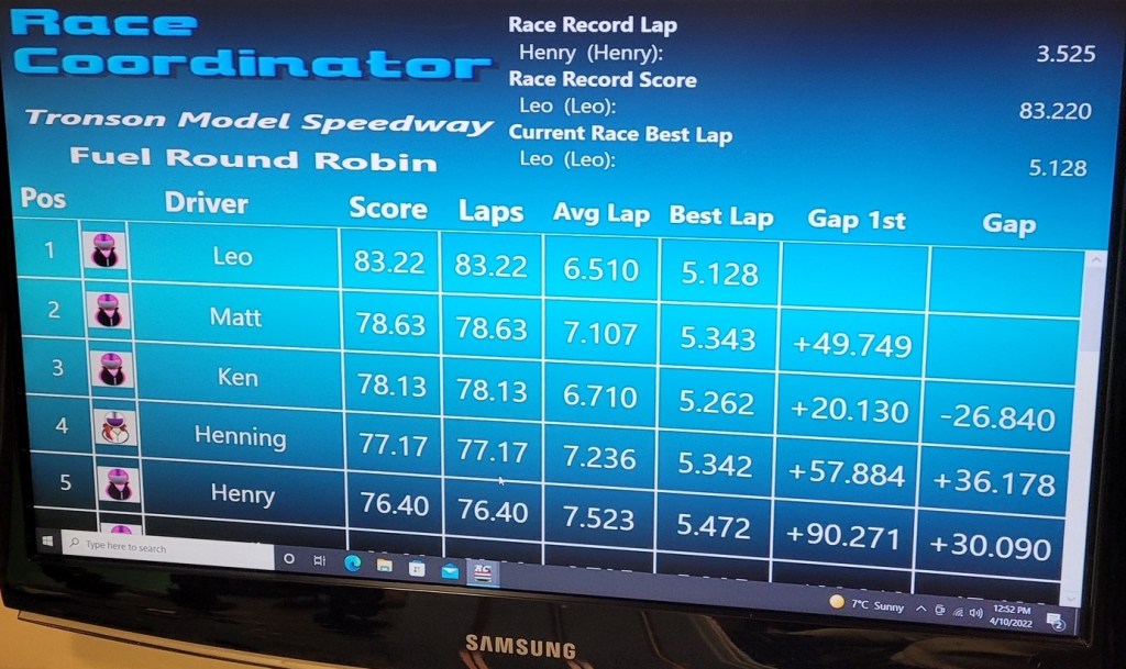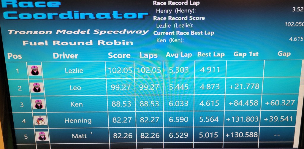 Fuel pit stops also played a large part in the results today. Most if not all racers were caught out at least once by the fuel light registering EMPTY while minding their own business and continuing to turn laps that were not counted as aresult of no fuel.