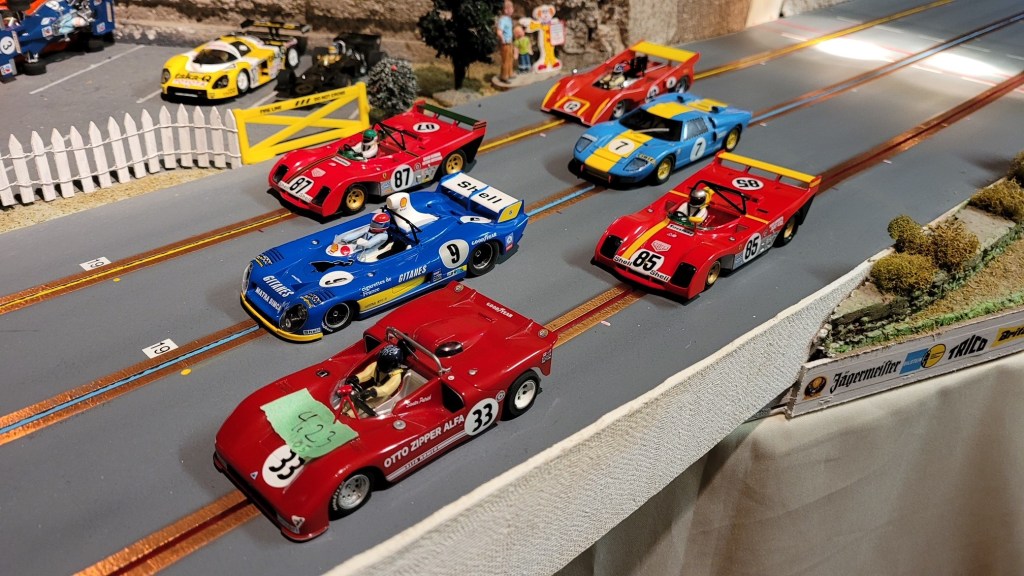 Next up was Vintage Slot.it with an Alfa 33/3, a pair of red Ferrari 312’s, a Ford GT40, a Matra 670b, and a McLaren M8D filling out the field. This fast field was again led by Leo when the final heat ended. However it was not won in the same dominant fashion as the first class. Lez posted the fastest race lap and was only a mere .1 of a lap down on Leo for 2nd after 9 minutes of racing. Ken was very consistent again rounding out the top 3 podium positions.Ā