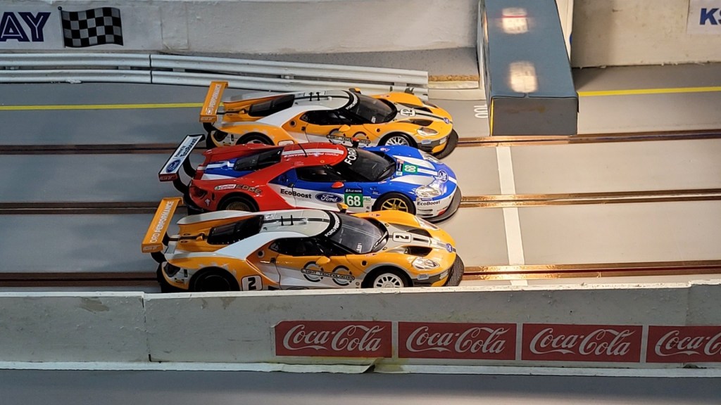 From there we jumped into the IROC class with 3 cars supplied by Henry. He had a trio of Ford GT’s, with a matching set of orange Fly’s and a Scalextric. These all were all highly modified and matched to within .1 of a second by our host Henry. Unfortunately one of the 2 identical Fly cars developed a tire rub or gear/engine issue that was unable to be overcome during racing and progressively got worse slowing down the final 3 drivers in that lane with Matt getting the worst of it.