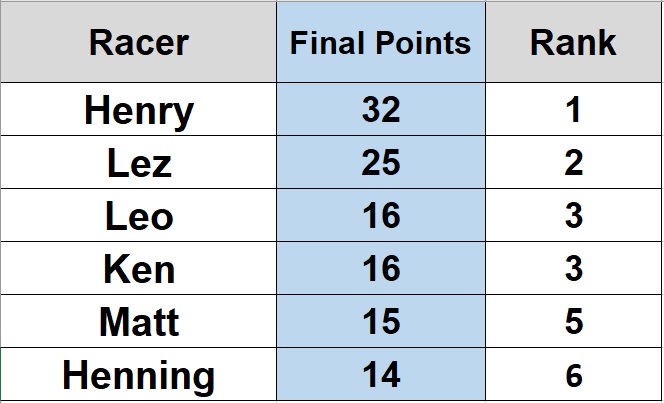 What a great day of racing with six club members showing up at Rogers Raceway with, Ken, Leo, Lez, Henning, Matt and our host Henry. Congratulations to Henry for winning the overall at Race #6 followed by Lez in 2nd and Leo / Ken tied for third.