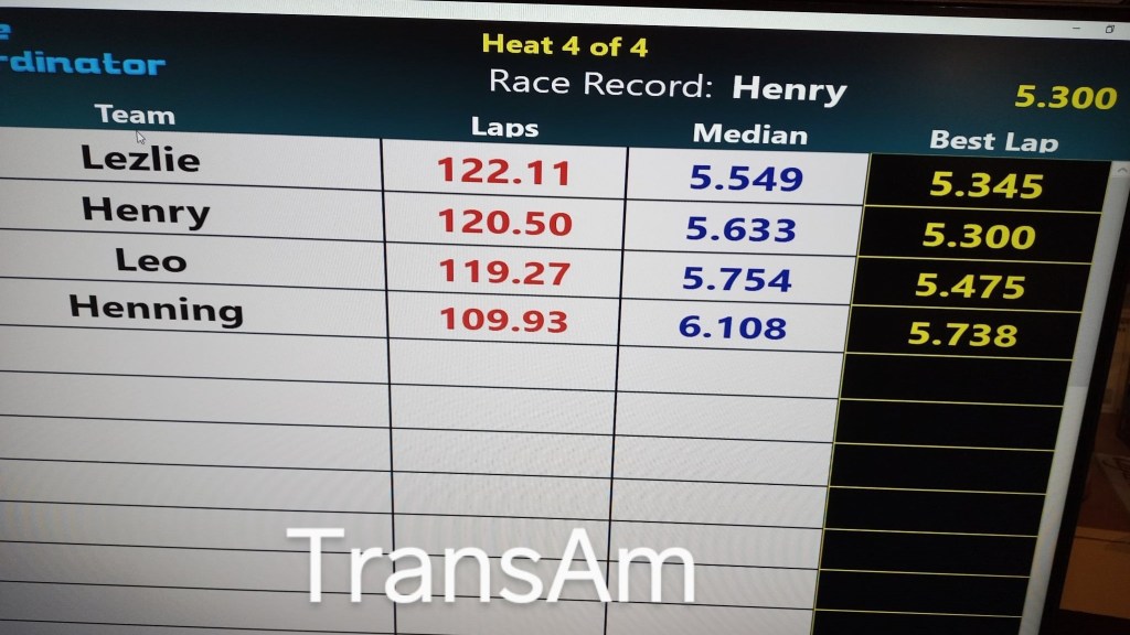 Congratulations to Lez for his three 1st place finishes on route to claiming the race at the Tronson Model Speedway. Leo finished in a solid second while Henry finished third even though he had the fastest lap time in two of the classes.