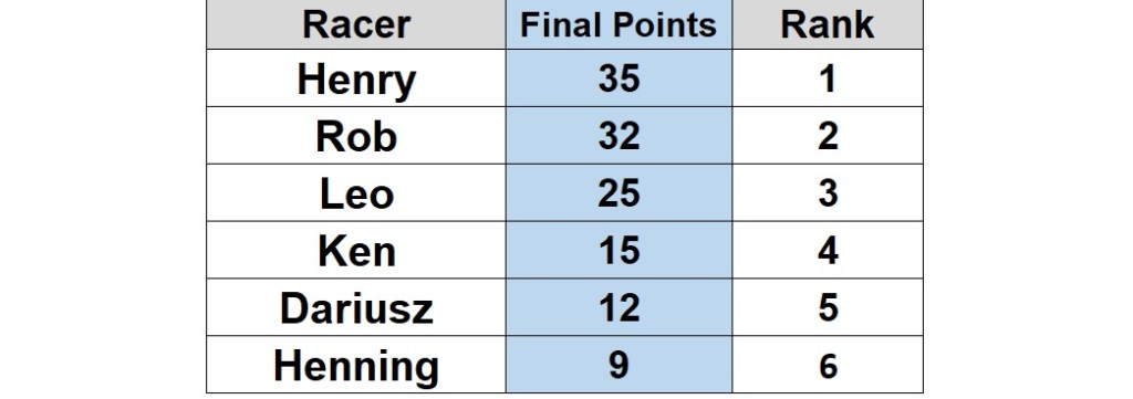 Six racers battled at Rogers Raceway. Very competitive racing, Rob at two wins, Henry with one win, and Leo with a win. In the end Henry’s dominance with fastest lap bonus points in every class earned Henry a well deserved victory. Ken, Dariusz, and Henning battled back and forth taking different position in every class too.