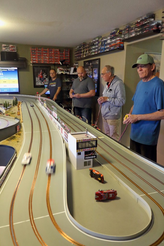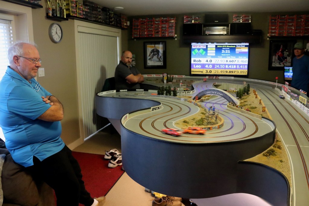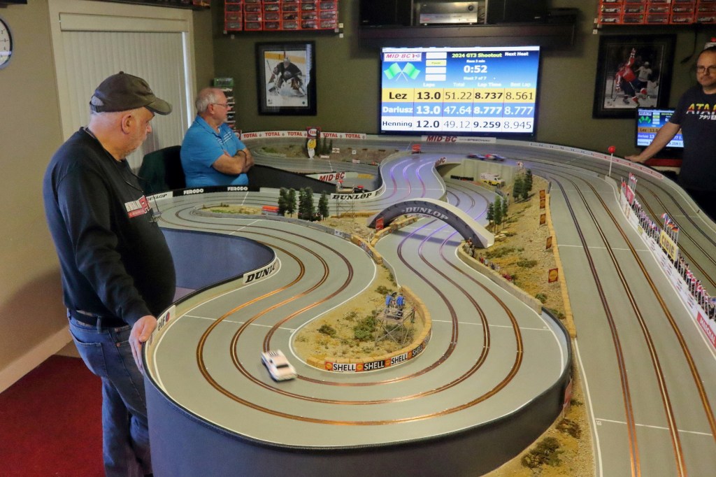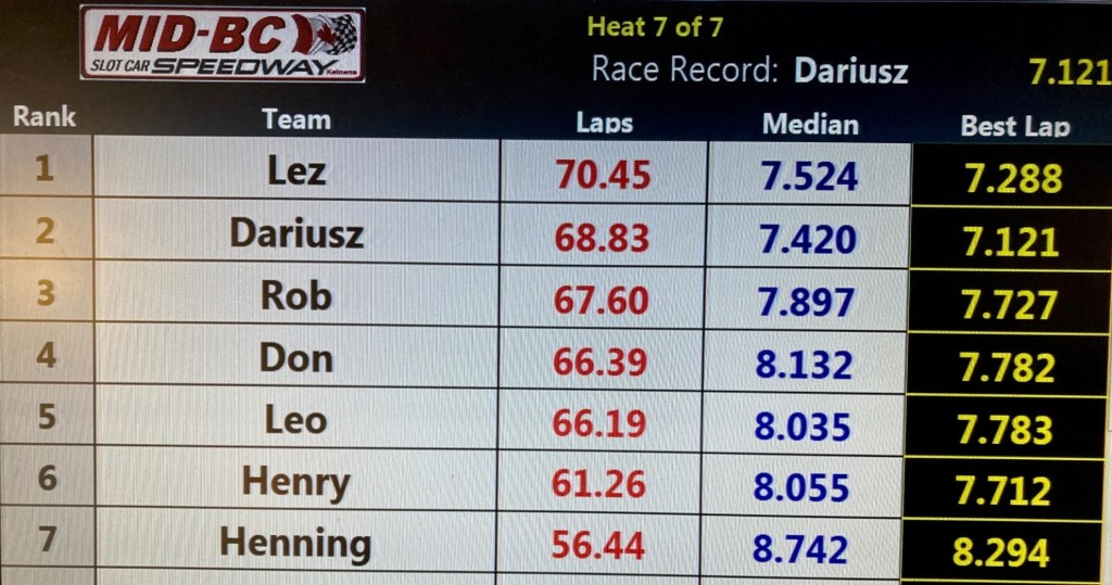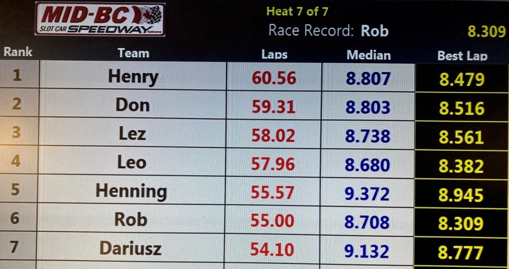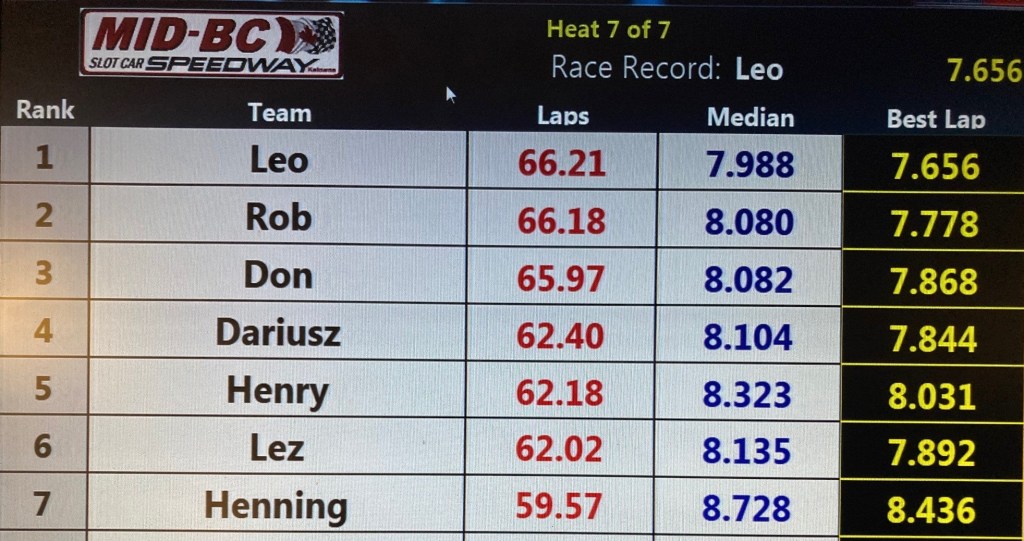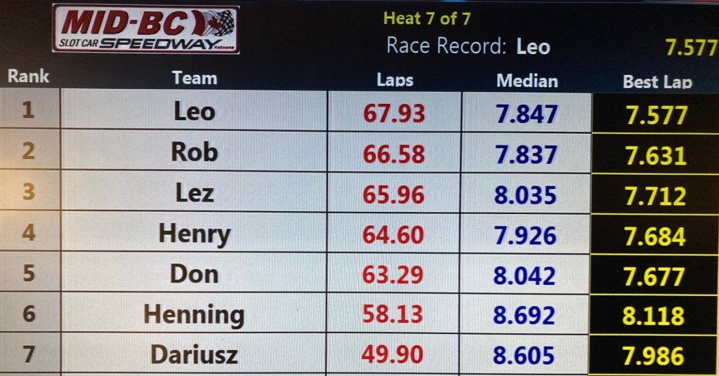 A great day of racing at MID-BC! Seven racers came out and it was the most competitive racing in a long time. At the end of the day all seven racers were below 30 points which made for a very close finish! Congratulations to Leo for a well deserved win, very consistent was the key. Rob and Lez finished tied for second place…..Rob is now looking for a proper rear wheel after his Mustang wheel coming loose 20 times! Nice seeing Don out at the races plus taking photos for us. Don and Henry tied at fourth. Dariusz and Henning at 6th and 7th. Dariusz gave us a great display of handling with his NSR GT3 Corvette……..wow! Second place in the Open GT class and fastest lap of the day.! Well done!!