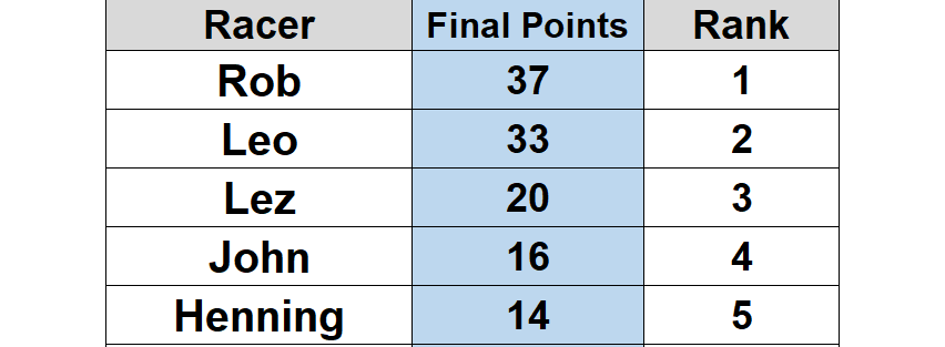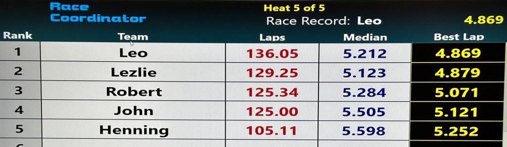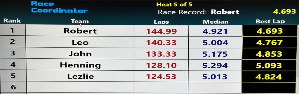 The racing was fierce at Tronson Model Speedway this past Sunday as all the drivers came out with guns a blazing! Leo and Rob each with two fastest lap points……….. Leo gave it his all but came up just short to finish second behind Rob. Lez finished third with John in fourth followed by Henning very close behind.