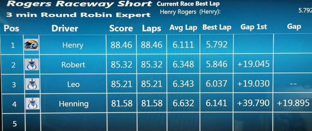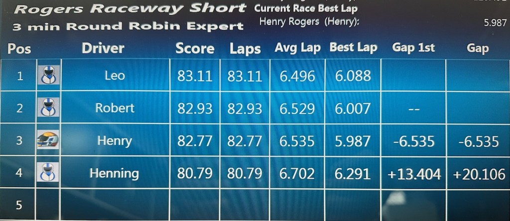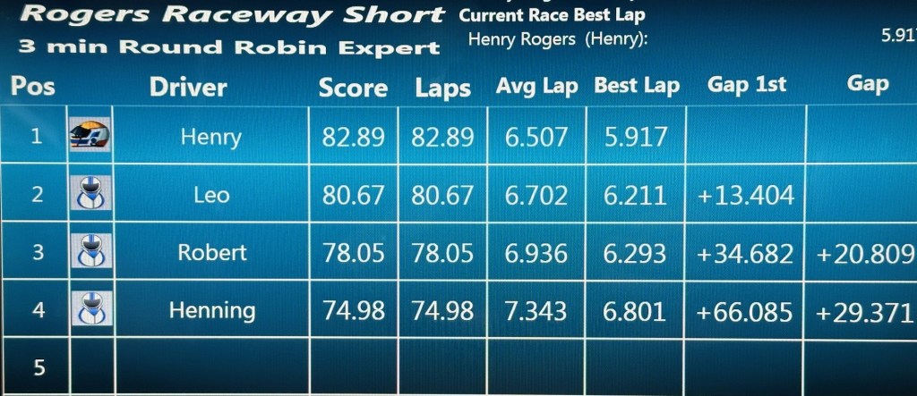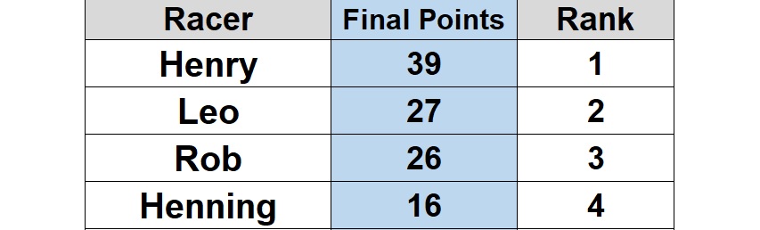 Race #7 was won decisively by Henry who had the fastest lap in all four classes. Leo prevented Henry from sweeping all four classes by winning the IROC class by a very slim margin. Congratulations Henry for a dominant performance! Second was Leo by the slimmest of margins over Rob and Henning rounded out the group in fourth.