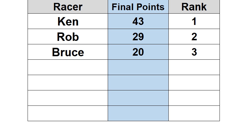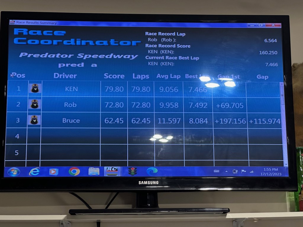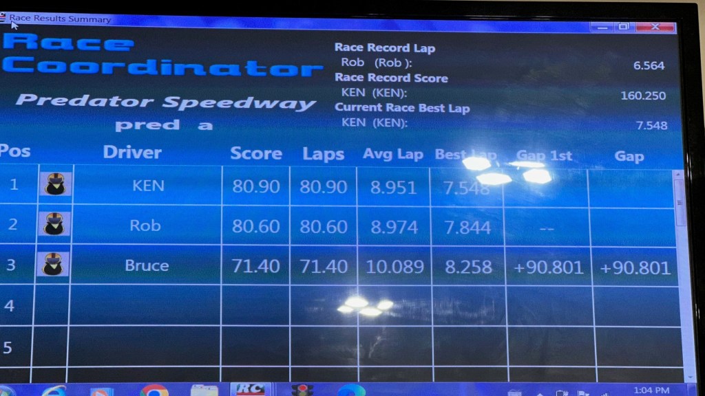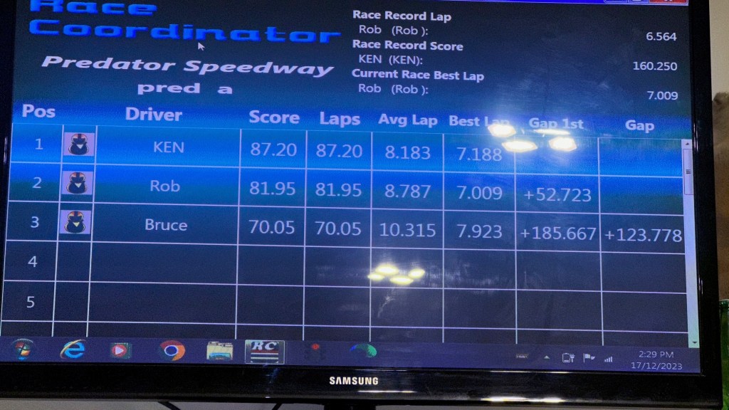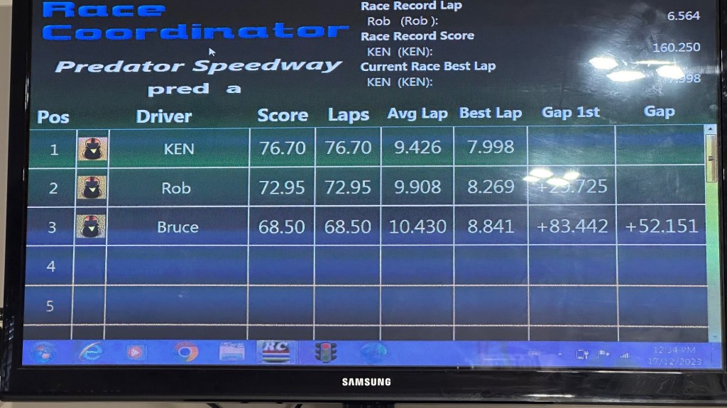 Thanks Ken for having Predator Speedway host the last race of 2023 this past Sunday. It was almost a clean sweep by Ken! Ken was held from achieving the maximum 44 points with Rob grabbing the fastest lap point on the last race of the day in Group C racing. Ken won all four classes, Rob second, and Bruce finishing third in all four classes.