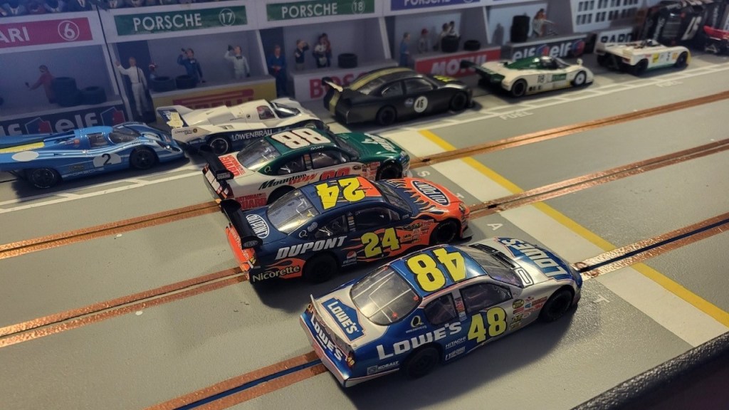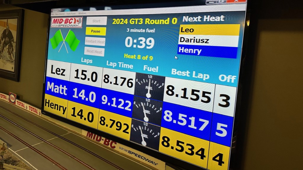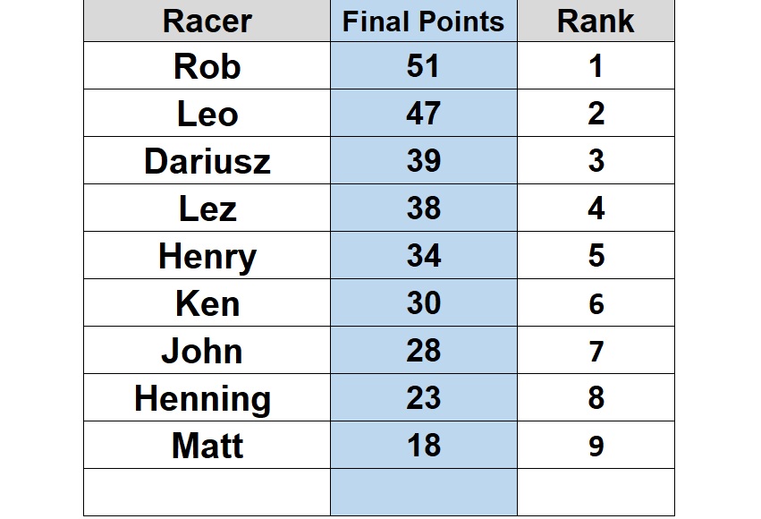 MID-BC was the host for this past Sunday’s race. A total of nine racers participated along with two visitors for an afternoon of fun competitive racing. Rob won two classes, Pre 1975 Classic Endurance & Group C. Lez won the Early Wing F1 and Leo won NASCAR. Shout out to Dariusz receiving the Fastest Lap bonus point in Early Wing F1. Overall result for the day has Rob 1st, Leo 2nd and Dariusz 3rd for the Podium.