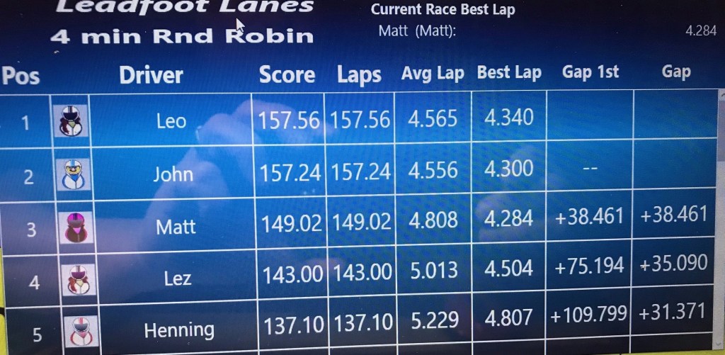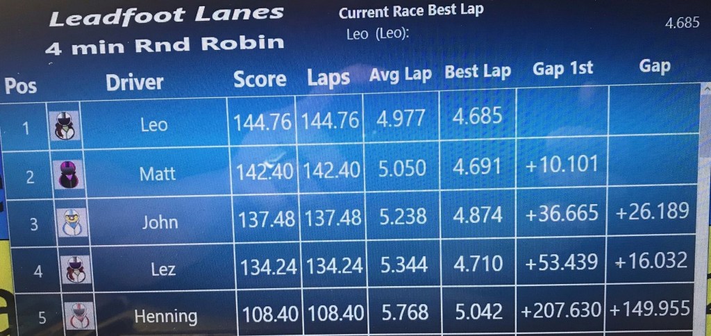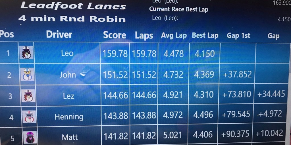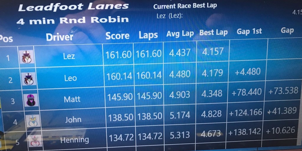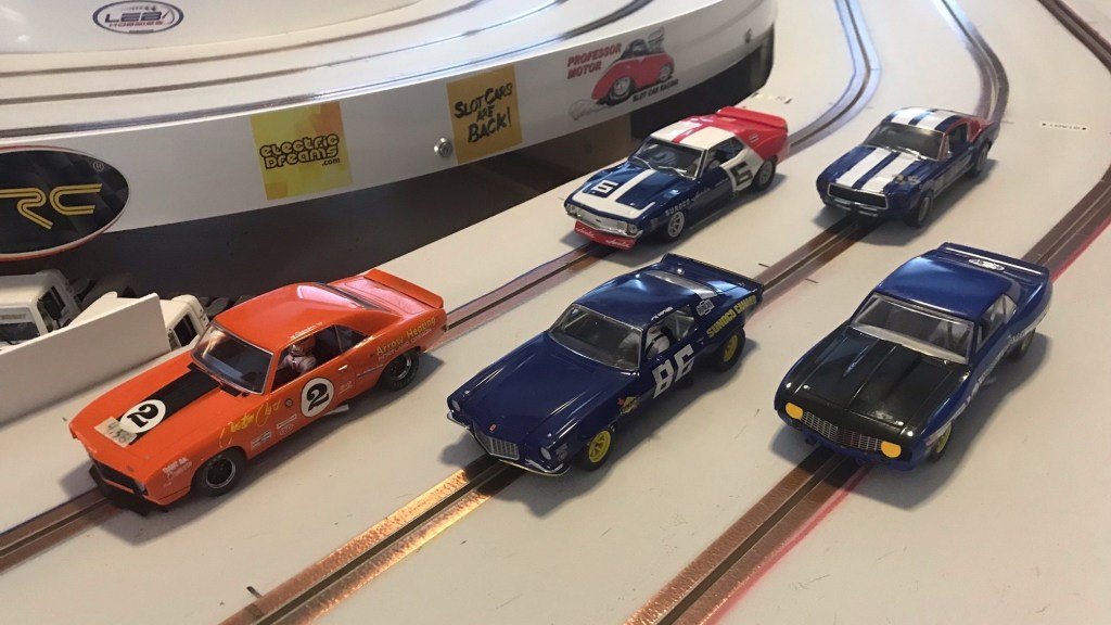 Kelowna Slot Car Club’s Leadfoot Lanes was the venue for slot car Race #13. Leo won the first three classes of the day Trans AM, Modern Slot.it and Vintage Slot.it to finish first overall. Lez sitting in fourth overall after three classes pulled out a win in the final class Open GT / Saloon to leapfrog John and Matt into second overall. John with a fresh tire change had a solid showing finishing second in Modern Slot.it and Vintage Slot.it to end up third overall. Matt’s fast blue Camaro was second in Trans AM to finish fourth overall. Henning had a fourth in Vintage Slot.it to finish 5th overall. Fastest laps of the day was Leo in Trans AM and Vintage Slot.it, Matt in Modern Slot.it and Lez in Open GT / Saloon.