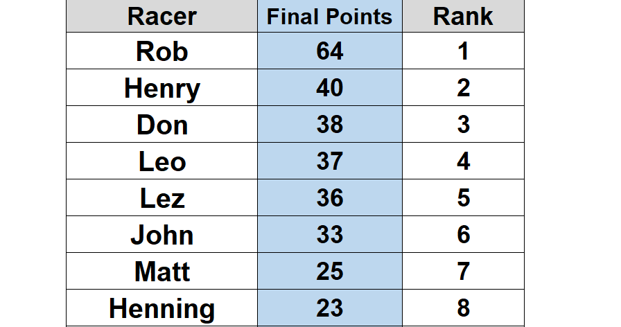 Eight Racers raced at MID-BC this past Sunday. Congratulations to Rob 1st, Henry 2nd and Don 3rd for finishing on the podium for Race #14. Only four points separated 2nd place from 5th place so one or two mistakes is all it took to drop you down the standings. Shout out to Don for his third overall and to John, Lez, and Henry for finishing on the podium in two classes.