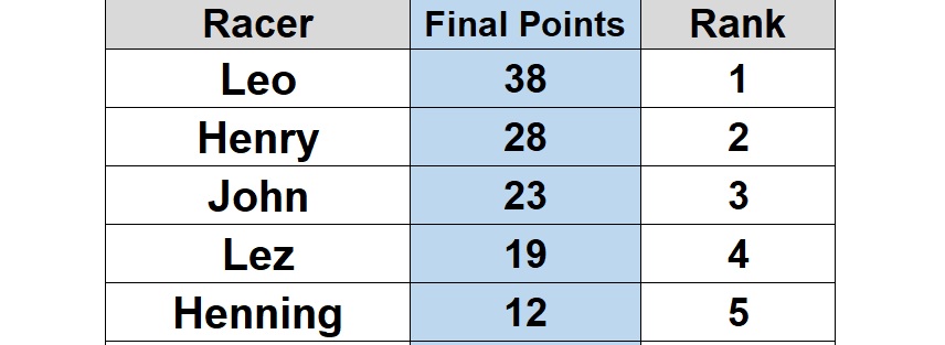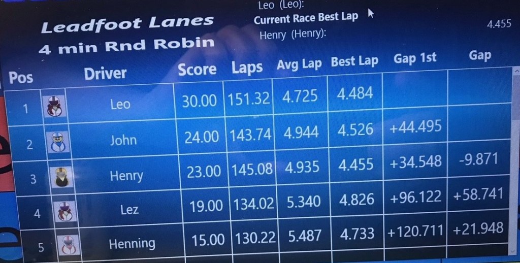 Results from last Sunday’s race at Leadfoot Lanes brought out a lot of slot car race battles. John winning in Group C prevented Leo from sweeping all the classes….wow great job both of you! Something else interesting, Leo and Henry were the only racers able to podium in all four classes too so a big congratulations for that feat! Fastest laps were split with Leo fastest in Nascar, Lez in Early Wing F1, and Henry fastest in Pre 1975 Classic Endurance and Group C. Kudos to the overall winner for the day Leo followed by Henry in 2nd and John in 3rd.
