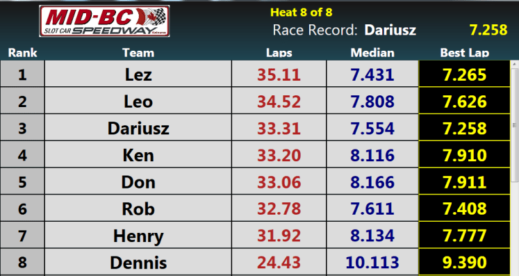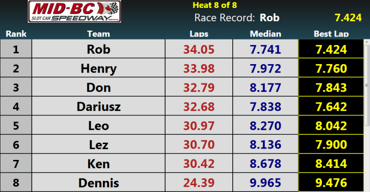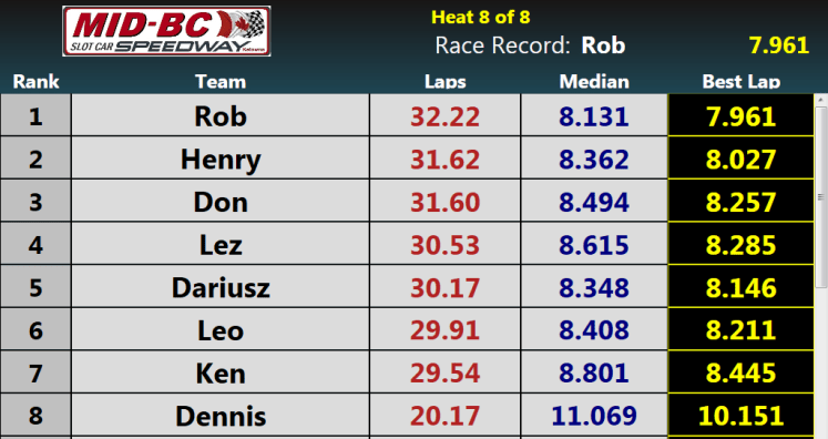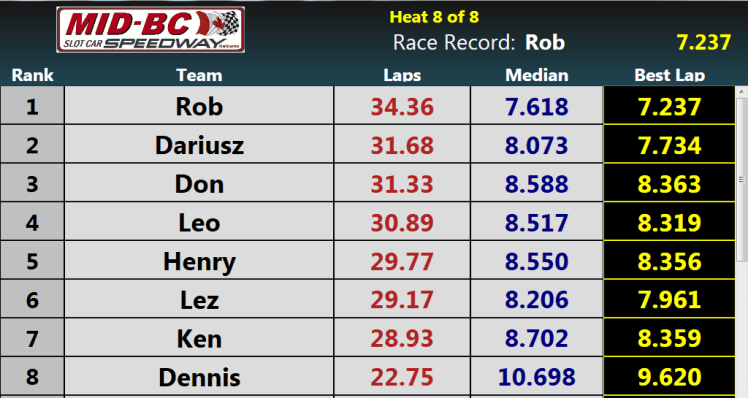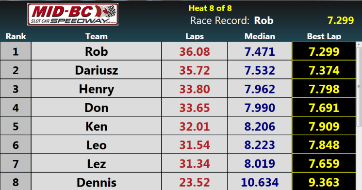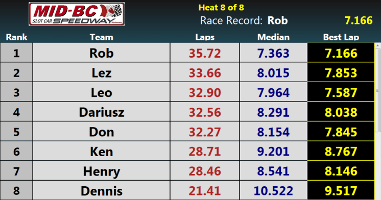 So we decided to do something a little different this year. The new season starts in October so why not hold a sprint race at MID-BC?! All eight classes were raced with 1 1/2 minute heats so we could finish up within four hours. It was a hectic and fun day with so many heats racing eight classes but it was enjoyed by all at the end of the day. In the end Rob took first place, but take a look at second thru sixth place…only six points separation. Looking at the final race results for each class it is understandable why it was so close as every class had very unique results. Congratulations to Dariusz for second place and Don rounding off the podium in third. Easily Henry, Leo or Lez could well have finished on the podium. It was also a special day for Dennis attending his first race and his fleet of cars he now owns, welcome aboard Dennis!