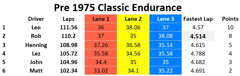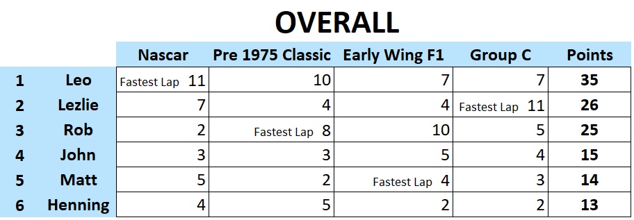 A great day of racing at Leadfoot Lanes…..it was fast like a roller derby but without getting hurt! Congratulations to Leo who was the only racer to podium in all four classes which eased him into winning the overall day. Lez finished in second with two podiums beating third place Rob by one point. Heading into the final race John, Matt, and Henning were all tied for fourth place and once the dust settled in Group C, John came out ahead finishing in fourth, Matt fifth and Henning sixth. Henning came out very strong in the first two classes of the day but the final two classes were his unfortunate undoing. Fastest lap bonus points went to four different racers which is very unusual. Leo in Nascar, Rob in Classic Endurance, Matt in F1, and Lez in Group C. Thanks Leo for hosting!