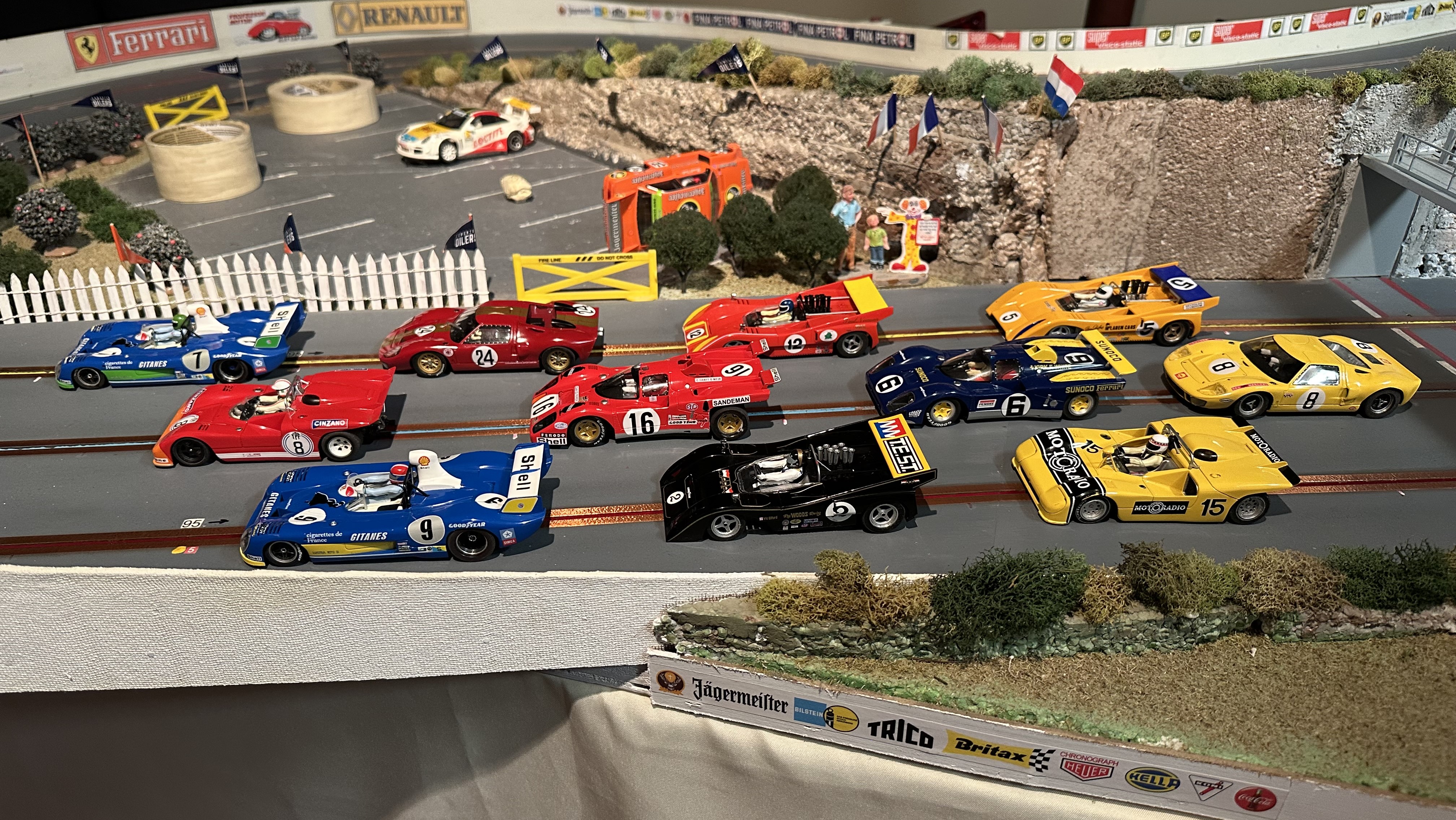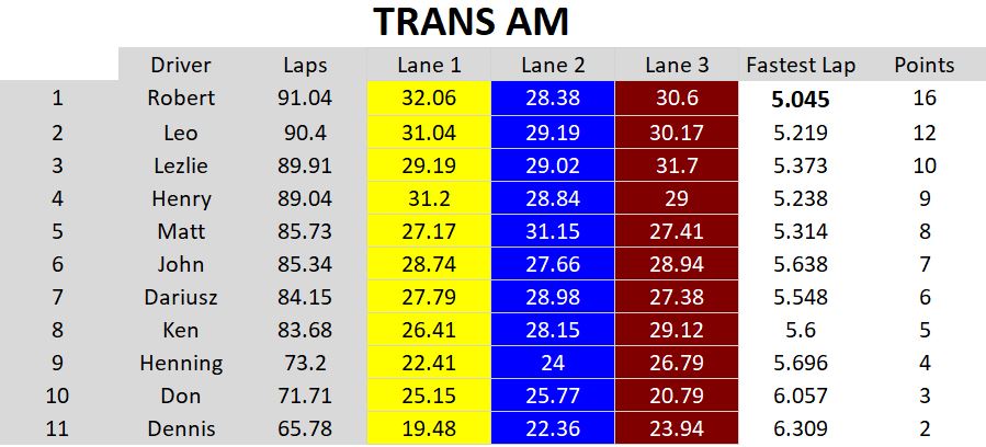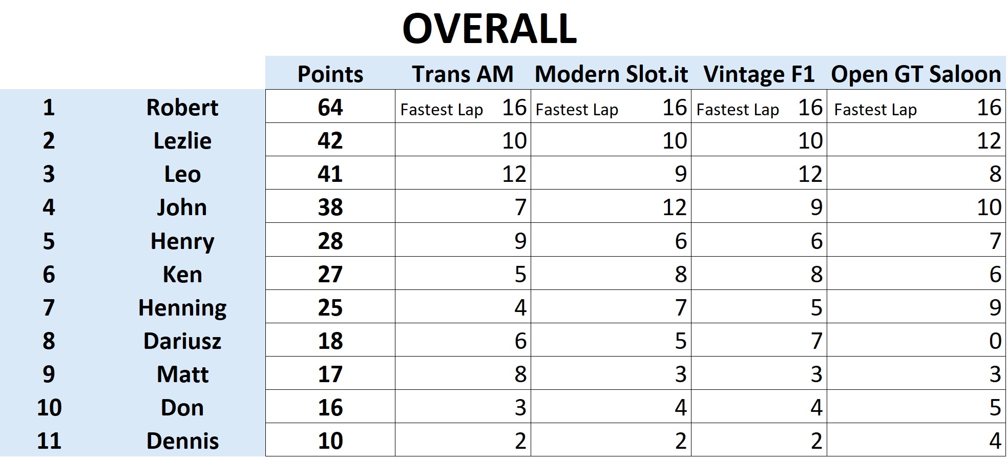 What a great showing at Tronson this past Sunday! Eleven racers including newcomer Don K. who showed up to battle each other with a lot of tight racing. Lez and Rob finished on the podium in all four classes each while Leo and John were able to podium two classes each. Overall Rob finished first, Lez 2nd and Leo 3rd for the podium. For 2nd place Lez and Leo only had one point separation between them. The deciding factor for 2nd place was the final class raced where Leo finished 5th in GT opening the door for Lez to slip past Leo. Close behind was John in 4th, and in a tight battle for 5th Henry finished in front of Ken 6th by one point. 7th Henning, 8th Dariusz (only three classes), 9th Matt, Don K 10th only a point behind Matt, and Dennis 11th. Classes raced were Trans AM (Pioneer & Scalextric), Modern Slot.it, Vintage Slot.it, and Open GT / Saloon which featured car brands NSR, Slot.it, Racer Sideways, Scaleauto, and Ninco.