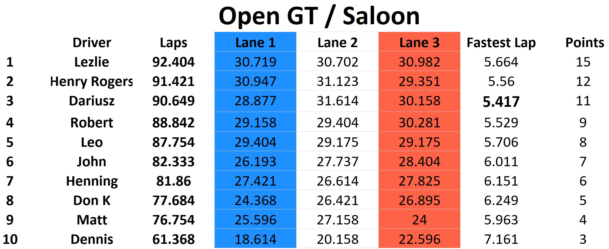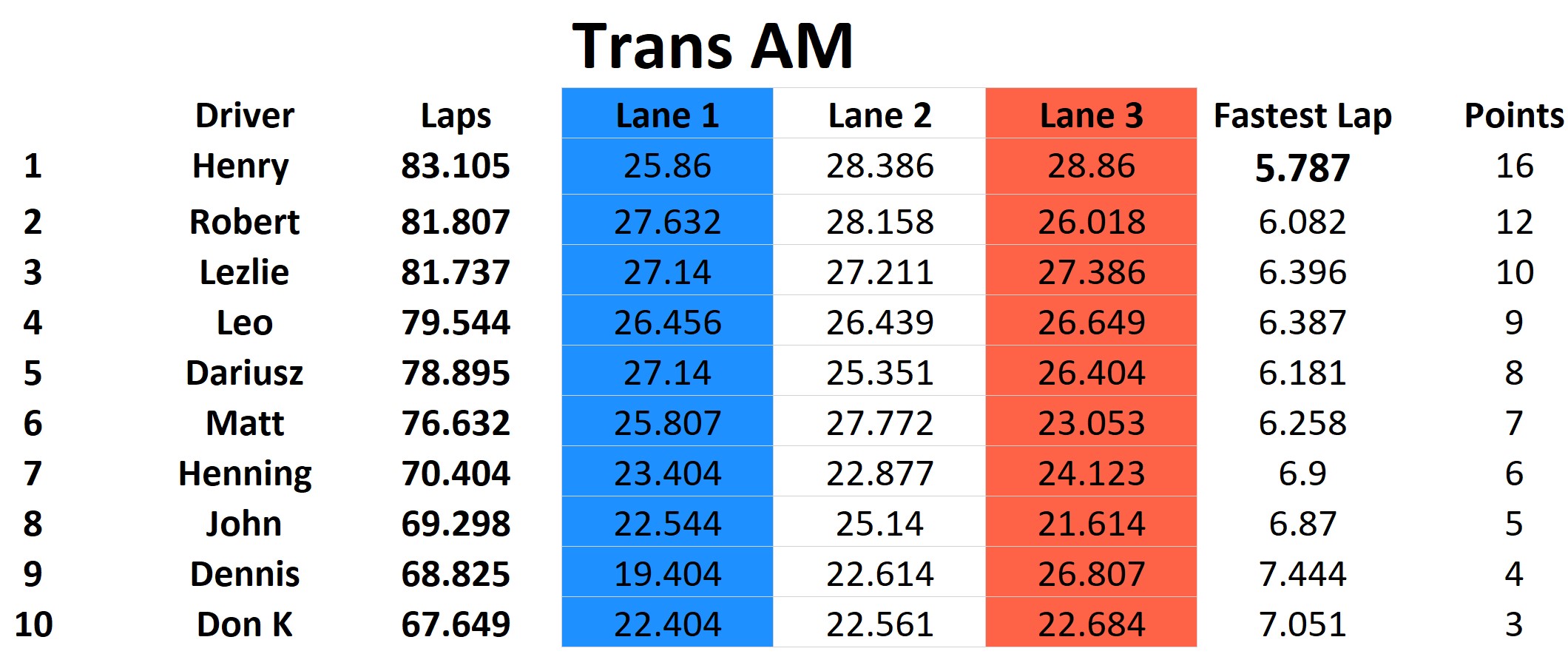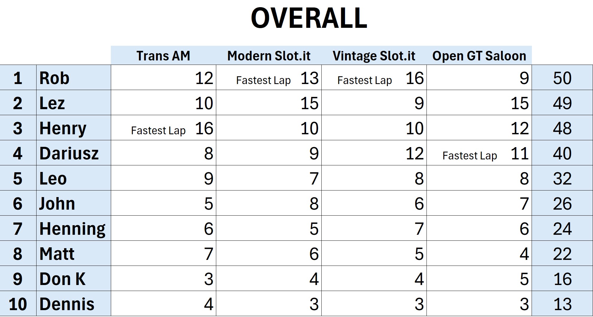 Another great turnout this past Sunday at Rogers Raceway. We thought the results at Predator Ridge a couple weeks ago were close but Sunday’s final results at Rogers Raceway were even closer. Congrats to Rob, Lez, and Henry….the podium was only two points apart total, never have seen it this close. Dariusz in fourth all by himself with eight points clearance on either side of him and Leo behind in fifth place. The middle of the pack was very tight with John 6th, Henning 7th, and Matt 8th with only four points separation between the three of them. Newcomers Don in 9th and Dennis in 10th. Fastest Lap bonus points were achieved by Henry (Trans AM), Rob (Modern Slot.it & Vintage Slot.it), and Dariusz (Open GT/Saloon).