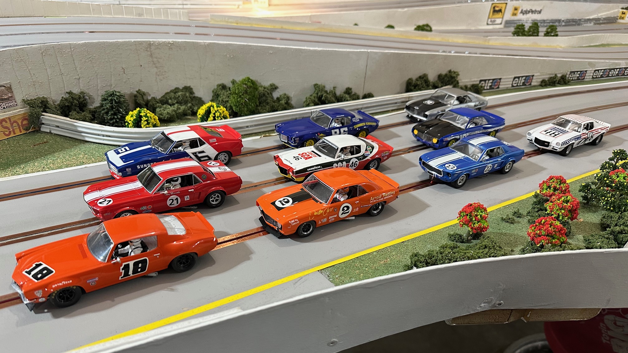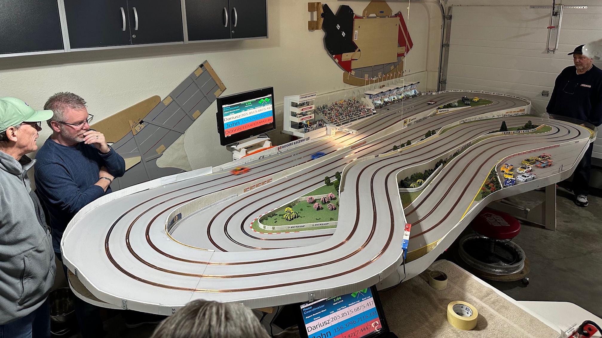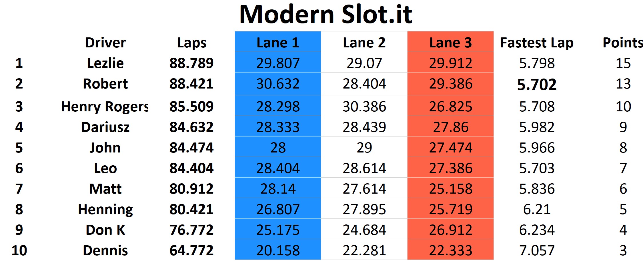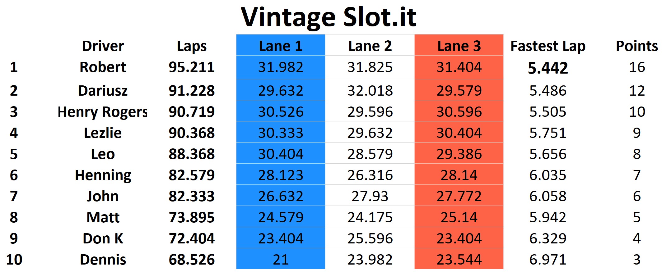 Another great turnout this past Sunday at Rogers Raceway. We thought the results at Predator Ridge a couple weeks ago were close but Sunday’s final results at Rogers Raceway were even closer. Congrats to Rob, Lez, and Henry….the podium was only two points apart total, never have seen it this close. Dariusz in fourth all by himself with eight points clearance on either side of him and Leo behind in fifth place. The middle of the pack was very tight with John 6th, Henning 7th, and Matt 8th with only four points separation between the three of them. Newcomers Don in 9th and Dennis in 10th. Fastest Lap bonus points were achieved by Henry (Trans AM), Rob (Modern Slot.it & Vintage Slot.it), and Dariusz (Open GT/Saloon).