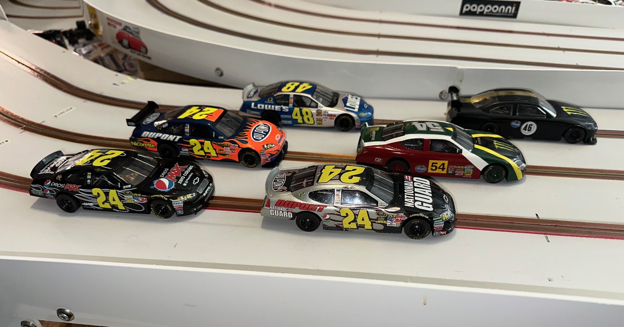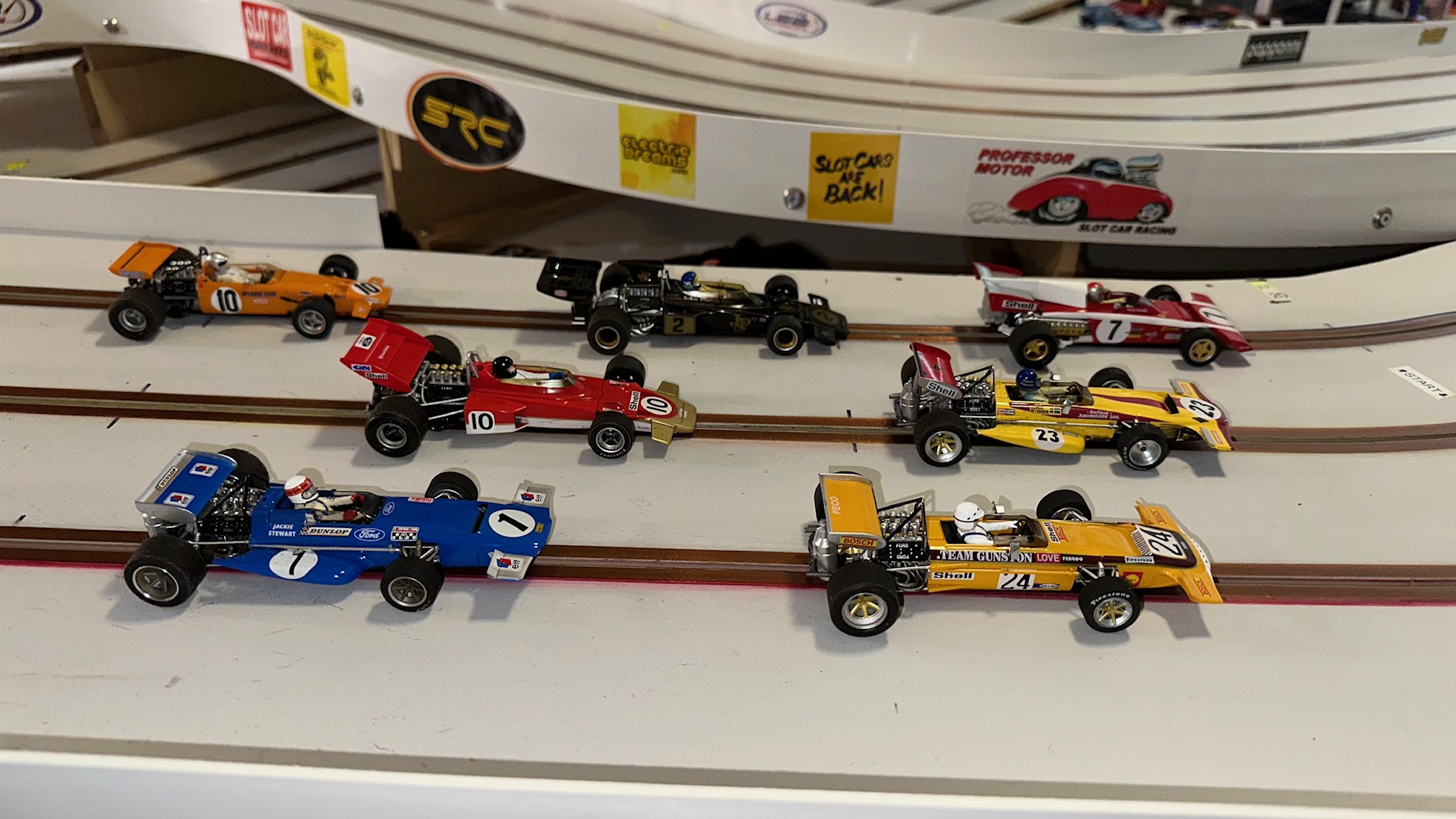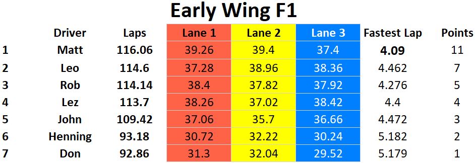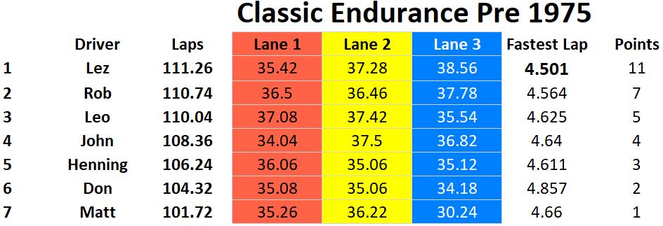 Congratulations to a great race performance by Leo winning two classes and finishing on the podium in all classes to finish 1st overall. Lez finished second and Rob third. John finishing second in Group C allowed him to jump over Matt to finish fourth overall. Matt had a convincing win in Early Wing F1 which enabled him to finish 5th overall even though he missed the Nascar race. Henning finished 6th and newcomer Don K in 7th. Fastest laps were acheived by Leo in Nascar & Group C, Lez in Classic Endurance, and Matt in Early Wing F1. Slot car racing was Scalextric Nascar, Pre 1975 Classic Endurance (Fly Classics), Early Wing F1 (Policar F1 & Scalextric F1), and Slot.it Group C.