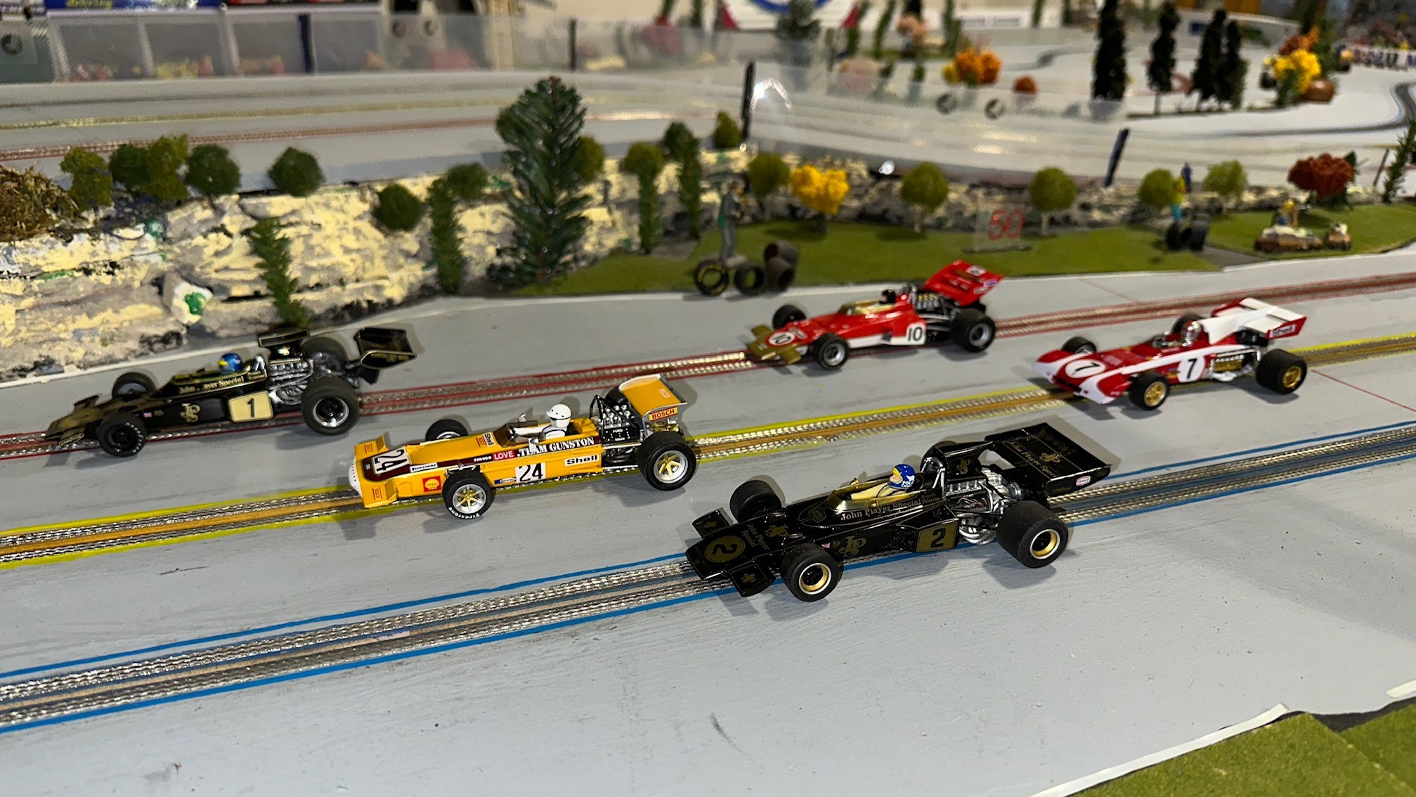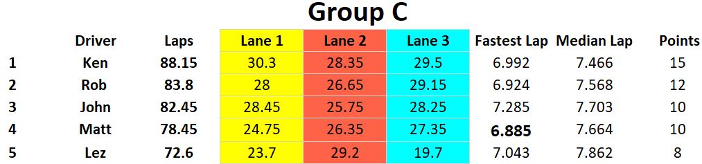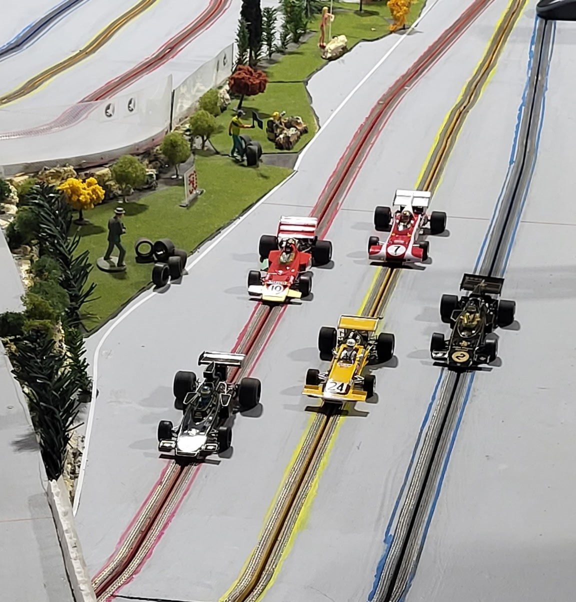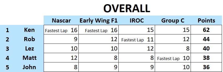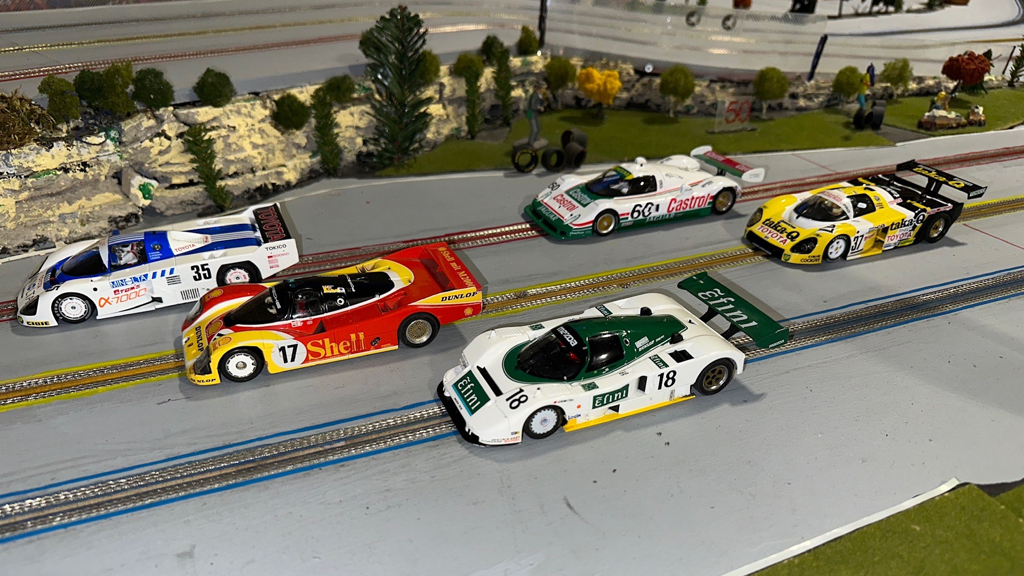 What a race day! Last time we raced here in January, Ken lost for the first time in seven years but on Sunday Ken came back with a vengeance and recaptured the Predator Cup after winning all four classes…..Congrats Ken! Rob was sitting in second place by only one point in front of Lez after three classes and managed hold onto second place after Lez had a lot of trouble in Group C. Lez finished in third, Matt fourth, and John fifth. All five racers finished in a podium spot this day too. Fastest laps went to Ken in Nascar and F1, Rob in IROC, and Matt in Group C. Classes raced were Scalextric Nascar, Policar & Scalextric F1, Racer Sideways Group 5, and Slot.it Group C.
