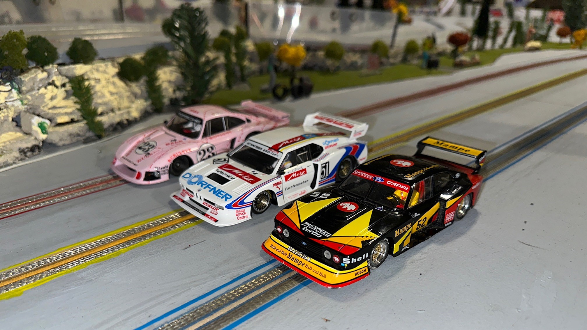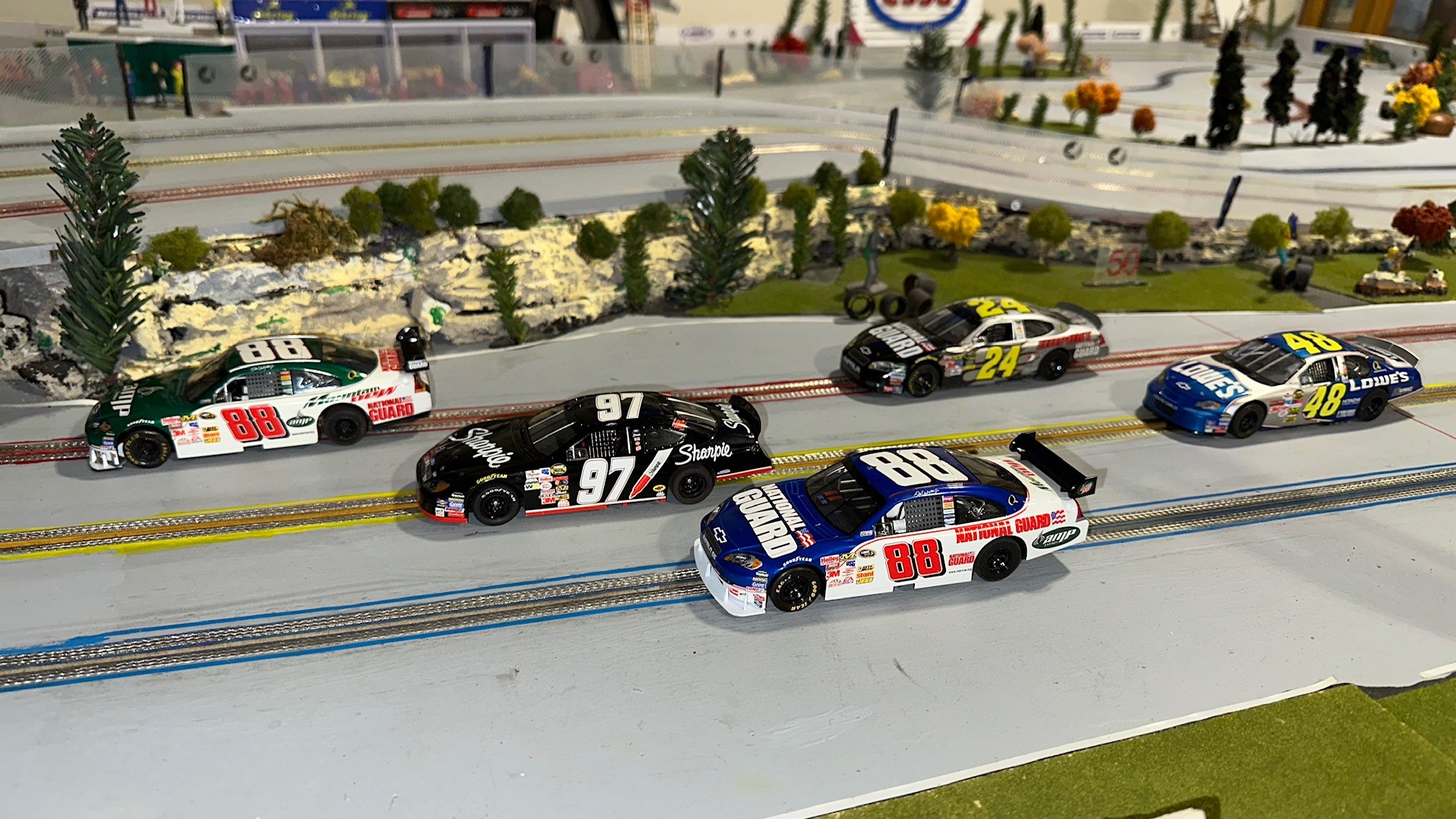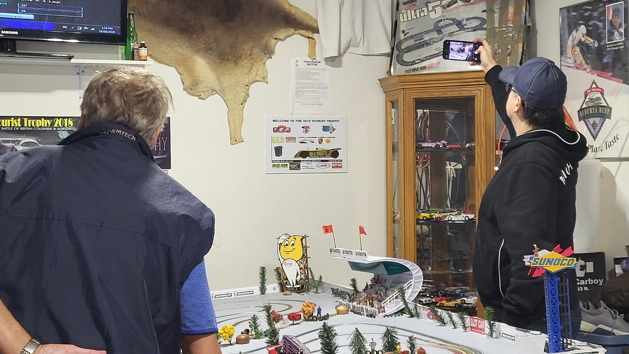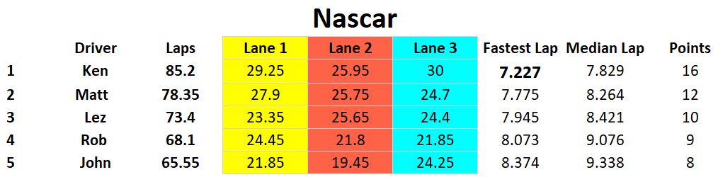 What a race day! Last time we raced here in January, Ken lost for the first time in seven years but on Sunday Ken came back with a vengeance and recaptured the Predator Cup after winning all four classes…..Congrats Ken! Rob was sitting in second place by only one point in front of Lez after three classes and managed hold onto second place after Lez had a lot of trouble in Group C. Lez finished in third, Matt fourth, and John fifth. All five racers finished in a podium spot this day too. Fastest laps went to Ken in Nascar and F1, Rob in IROC, and Matt in Group C. Classes raced were Scalextric Nascar, Policar & Scalextric F1, Racer Sideways Group 5, and Slot.it Group C.