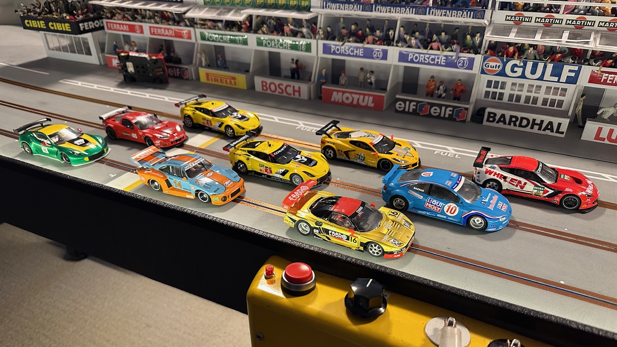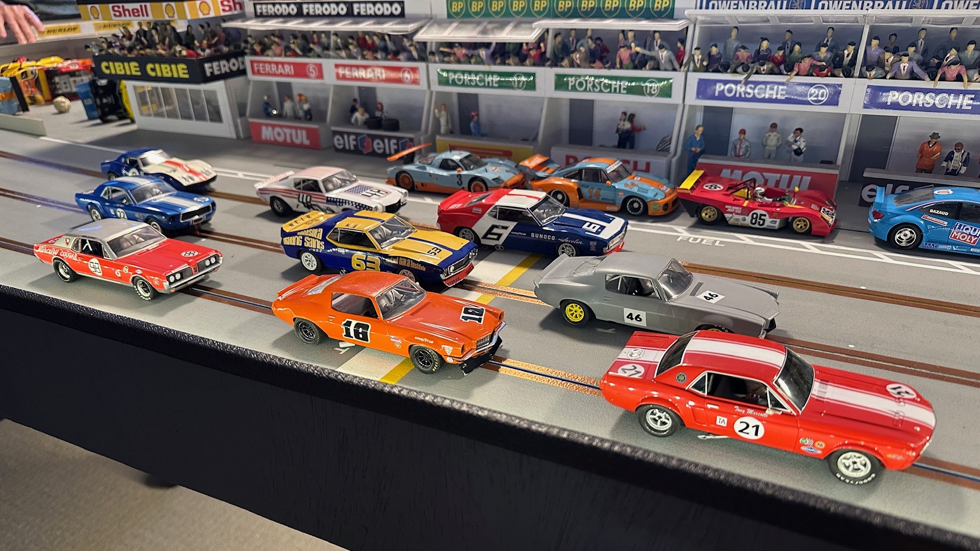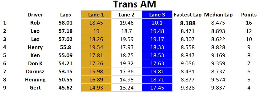 After last week’s fun and competitive Trans AM Proxy at Henning’s track, the slot car racing shifted over to Race #1 at MID-BC Speedway. Overall Rob finished 1st, Dariusz 2nd, and we had a tie for 3rd with Henry & Lez. If it was not for a disastrous Trans AM race for Dariusz he would of been battling for first overall. Shout out to Don K who joined us last season and had an excellent day of racing finishing a very solid 6th overall. It was very nice to see our friend Gert stop by to race for the first time since the 2012 /13 season. Gert is one of the original racers in our group when we all first met in 2007 and established organized racing. Classes raced were Pioneer Scalextric Trans AM, Modern Slot.it, Vintage Slot.it, and Open GT / Saloon cars.
