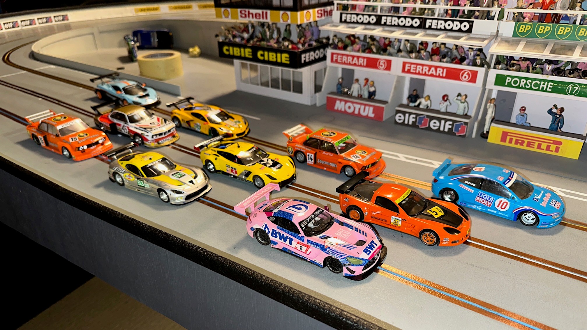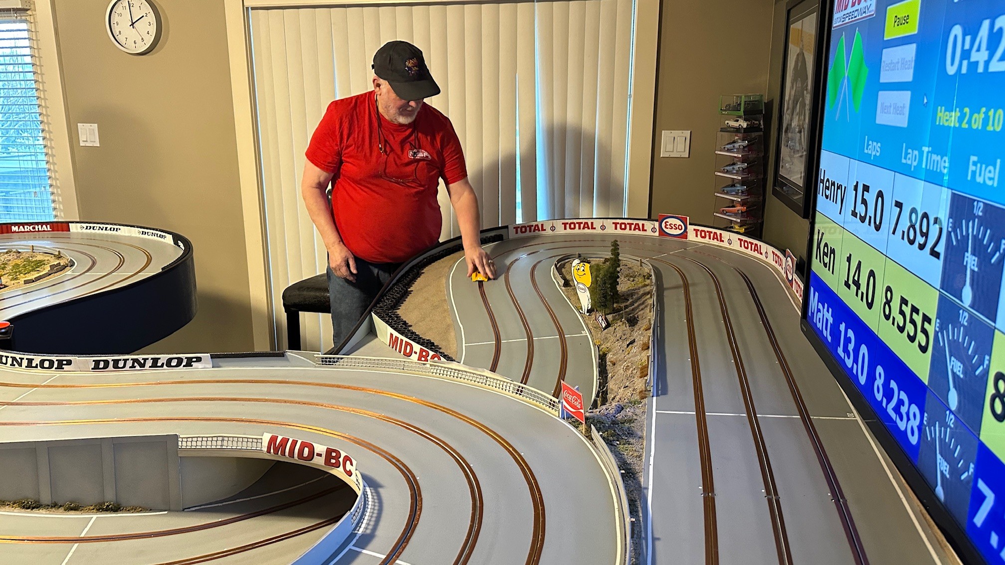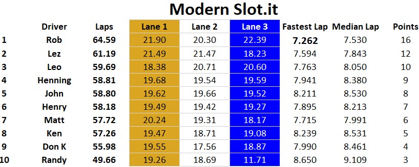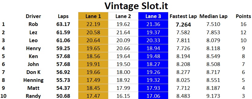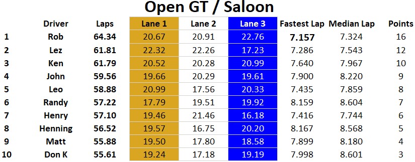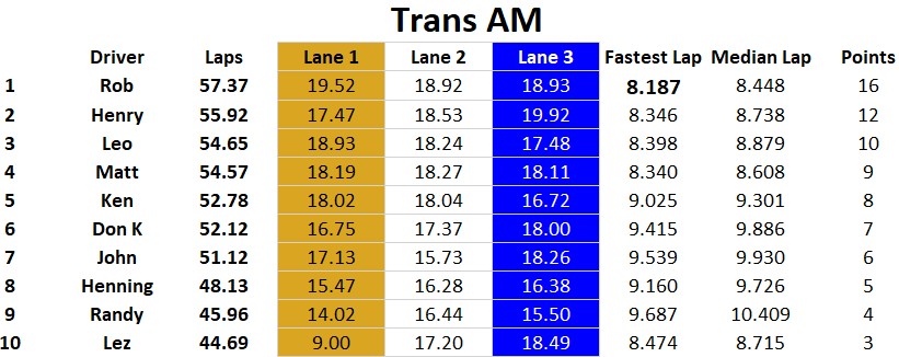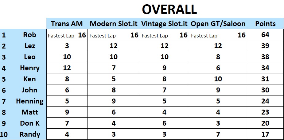 Ten racers came to compete at MID-BC for an afternoon of racing. Congrats to Rob, Lez and Leo for finishing on the podium. Henry, Ken, and John were within striking distance of the overall podium with very competitive race cars too. It was a battle all day with many close races…. thank you to all racers. Classes raced today were Scalextric & Pioneer Trans AM, Modern Slot.it, Vintage Slot.it, and Open GT / Saloon featuring NSR, Racer Sideways, and Scaleauto cars.