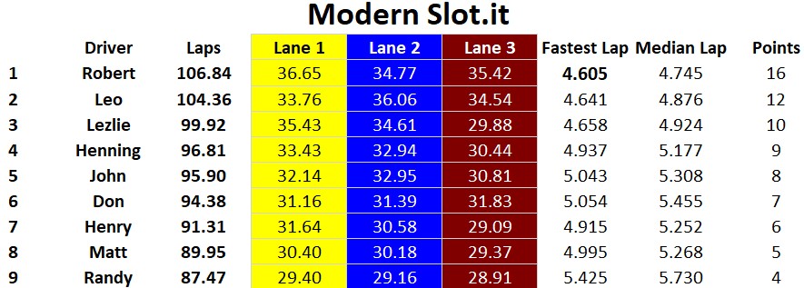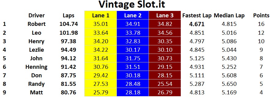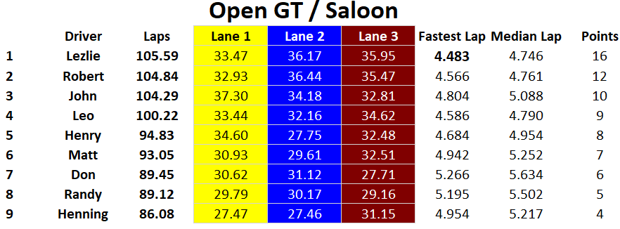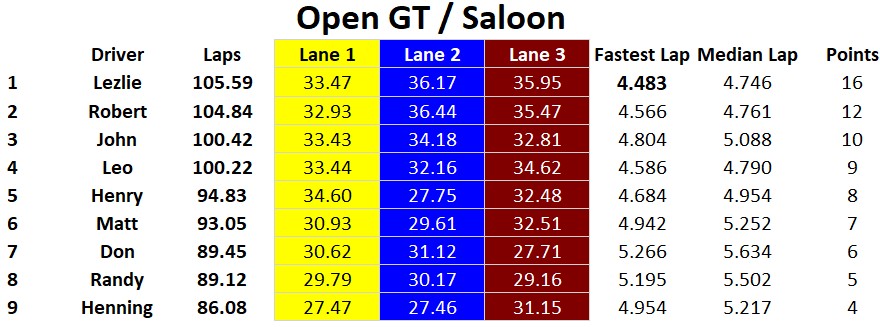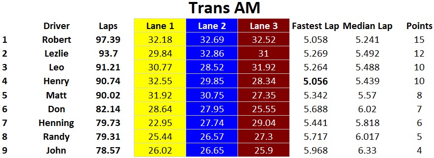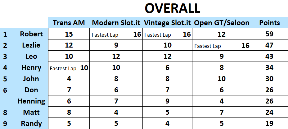 Another great day of racing at the Tronson Speedway, congratulations to the overall podium: 1st Rob, 2nd Lez, and 3rd Leo. Henry finished fourth overall and managed to get the fastest lap in Trans AM but his slower Medium Time held him off the podium in Trans AM. John finished in fifth overall, he had a very solid day with a podium in the open GT / Saloon class. Henning and Don K battled all day against each other and nothing was settled when they finished tied for sixth with each other. Close behind was Matt in eighth and Randy in ninth. Fastest laps were split amongst three racers Rob: Modern Slot.it & Vintage Slot.it, Henry: Trans AM, and Lez in Open GT / Saloon.