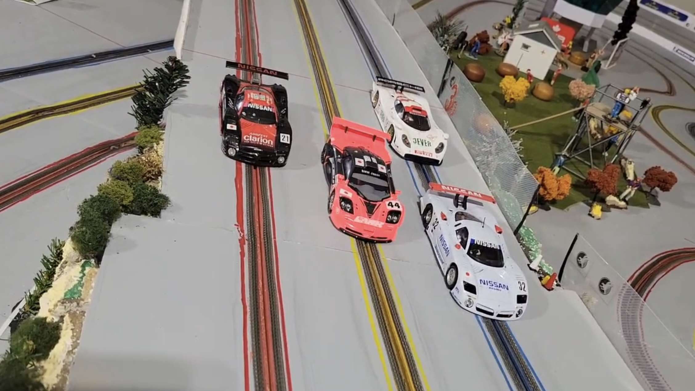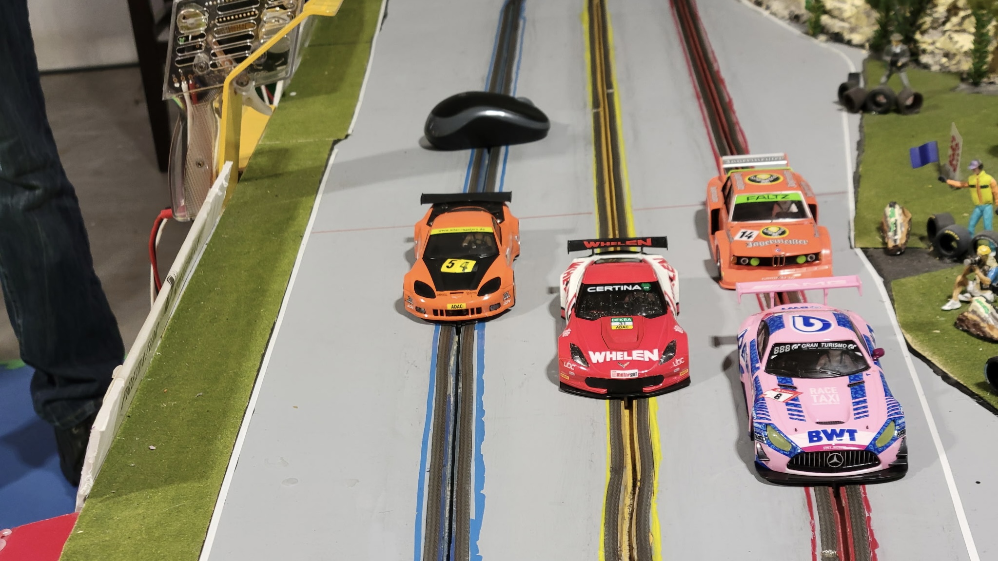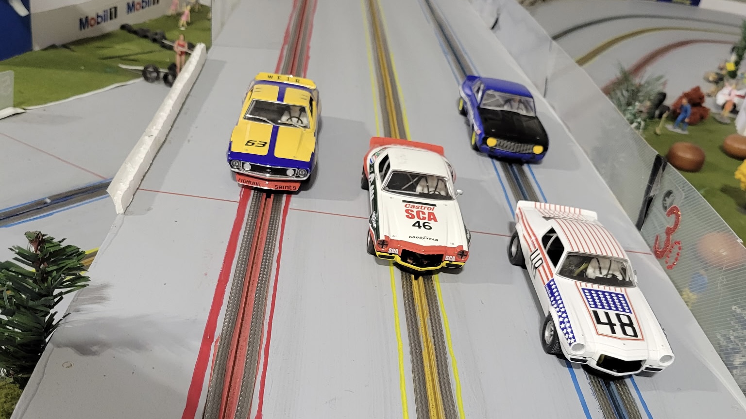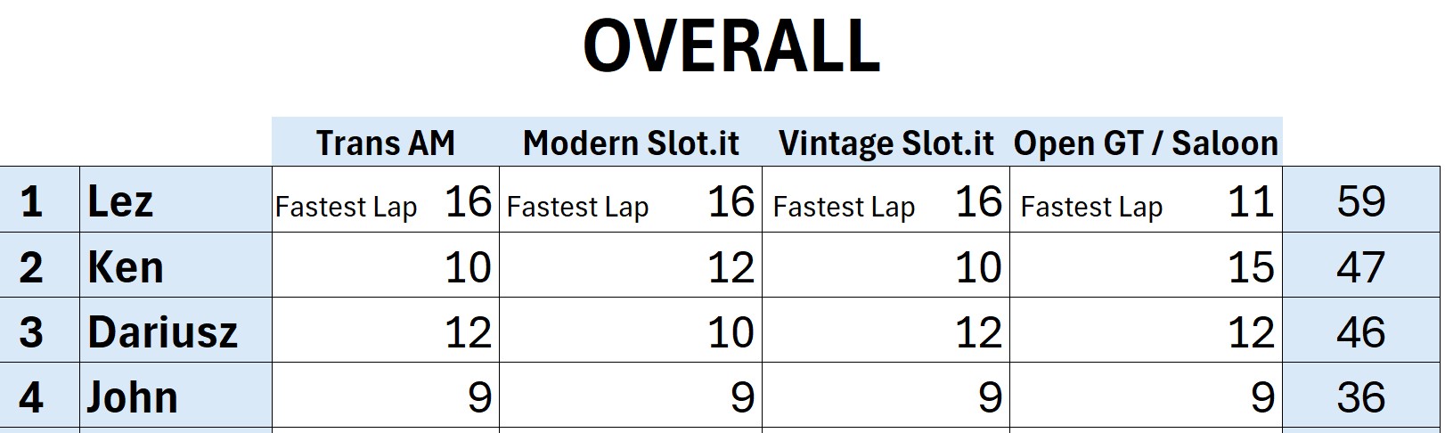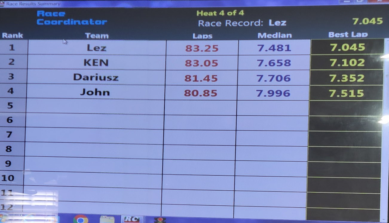 It was a hectic day of racing with four very fast competitors in action. At the end of the day when the dust settled Lez came out on top taking three first place podiums and the fastest lap in all four classes. Ken struggled with pieces of scenery stuck in his car in the Trans AM class and lost body screws in the modern slot it class. However when push came to shove he did finish 1st in the open GT class. Dariusz was very fast throughout setting a new track record in the Red lane in the open class. John fought all the way through out all classes . The high light of his day probably was the fact he could ride his motorcycle to the race in February. Classes raced Scalextric Trans AM, Modern Slot.it, Vintage Slot.it, and Open Gt / Saloon