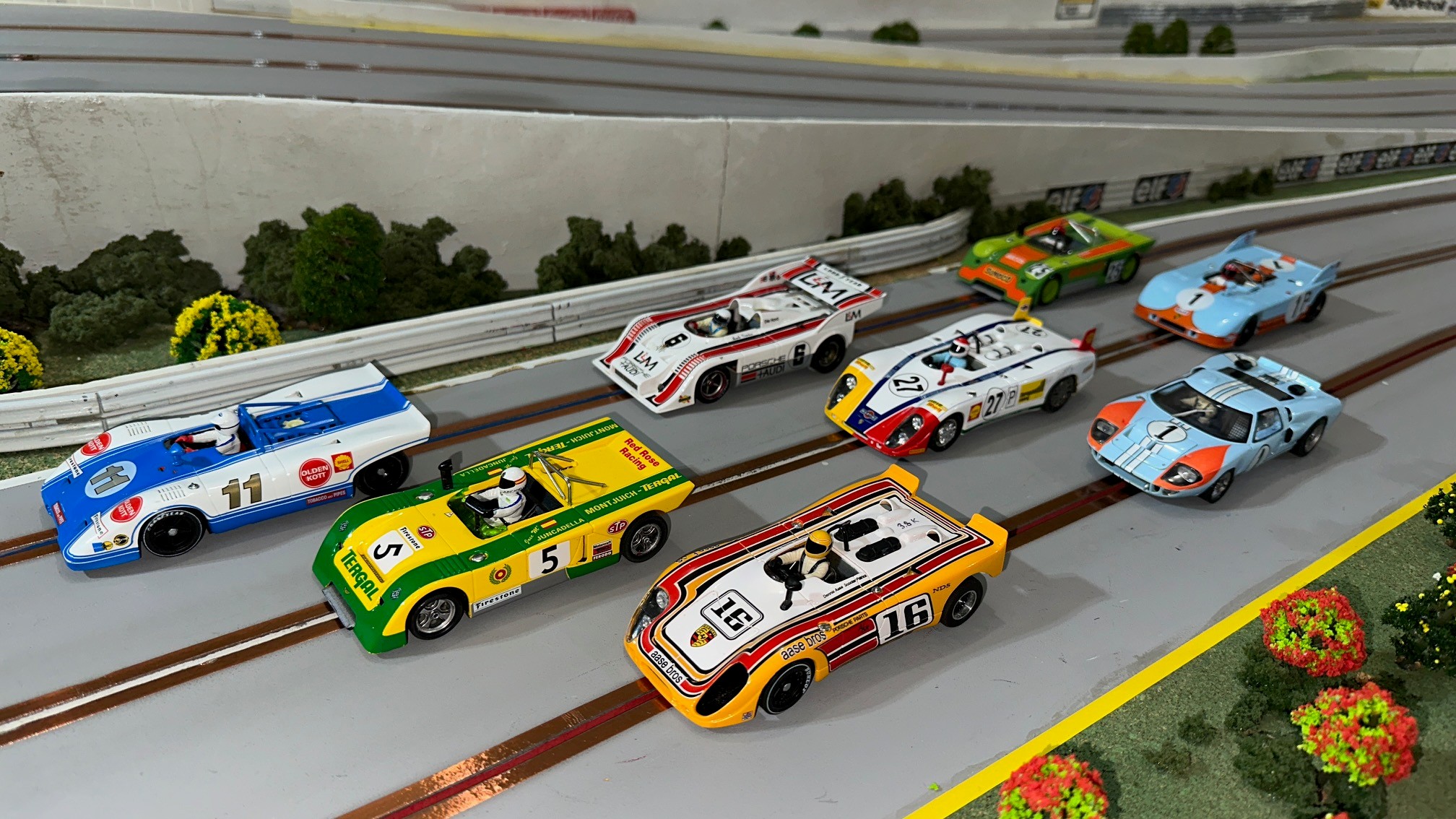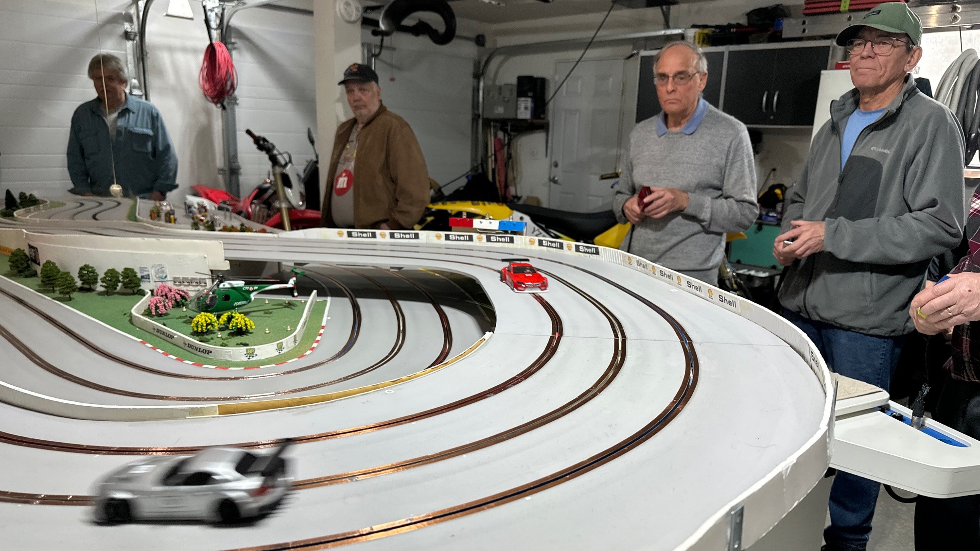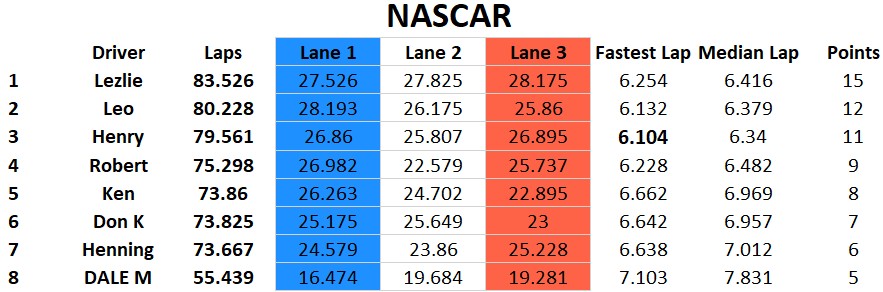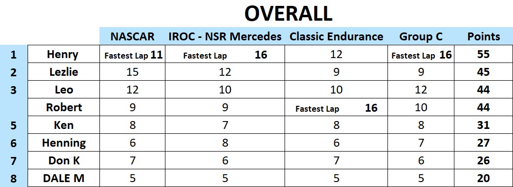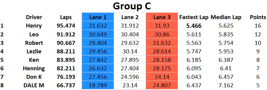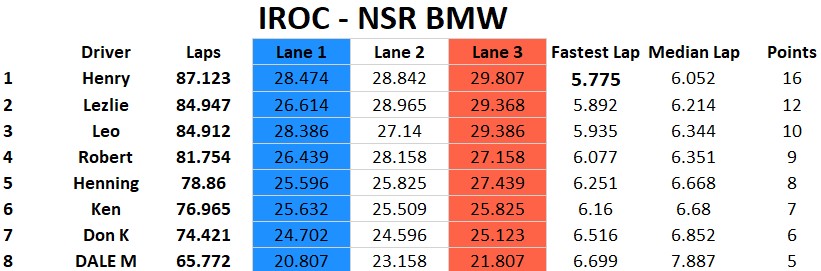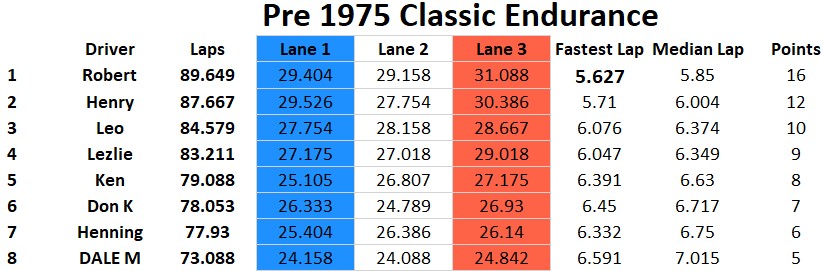 I think we had the closest finish on the podium ever this past race at Rogers Raceway. Four cars on the podium and three of the cars were within a point of each other. Congratulations to Henry for the win and followed by Lezlie, Leo and Rob on the podium. Ken finished a solid fifth and Henning in sixth managed to stay ahead of Don by one point. Newcomer Dale finished in eighth. Classes raced were Scalextric Nascar, NSR BMW, Fly Classics, and Slot.it Group C.