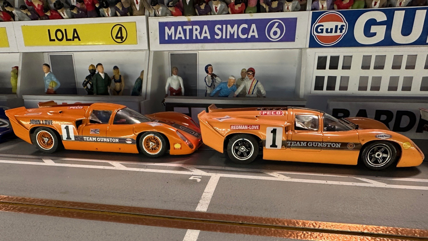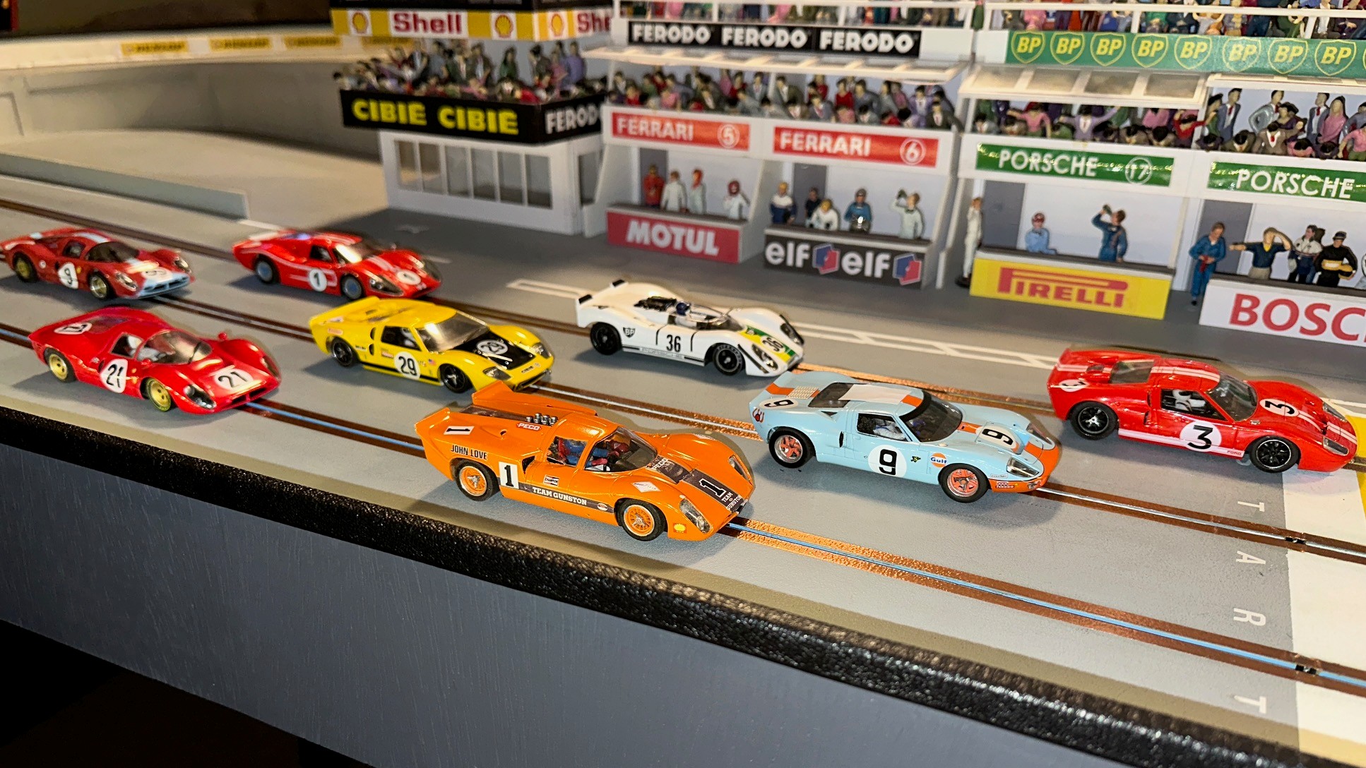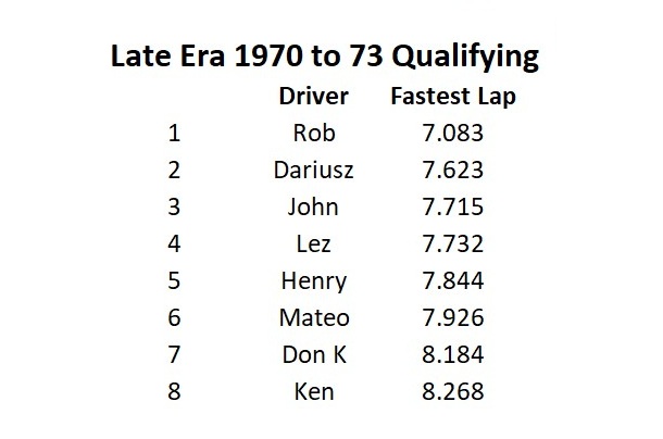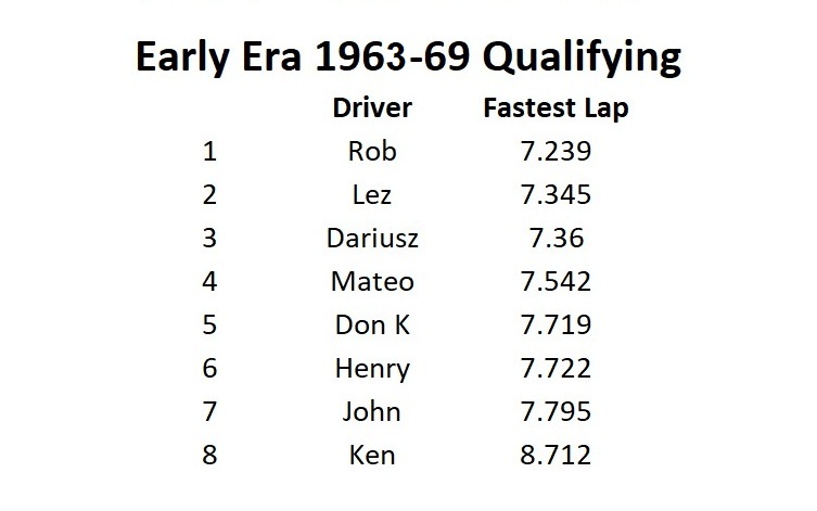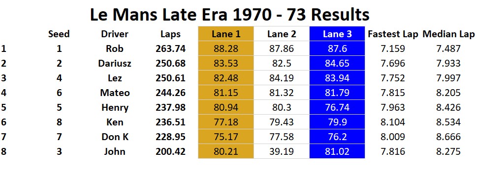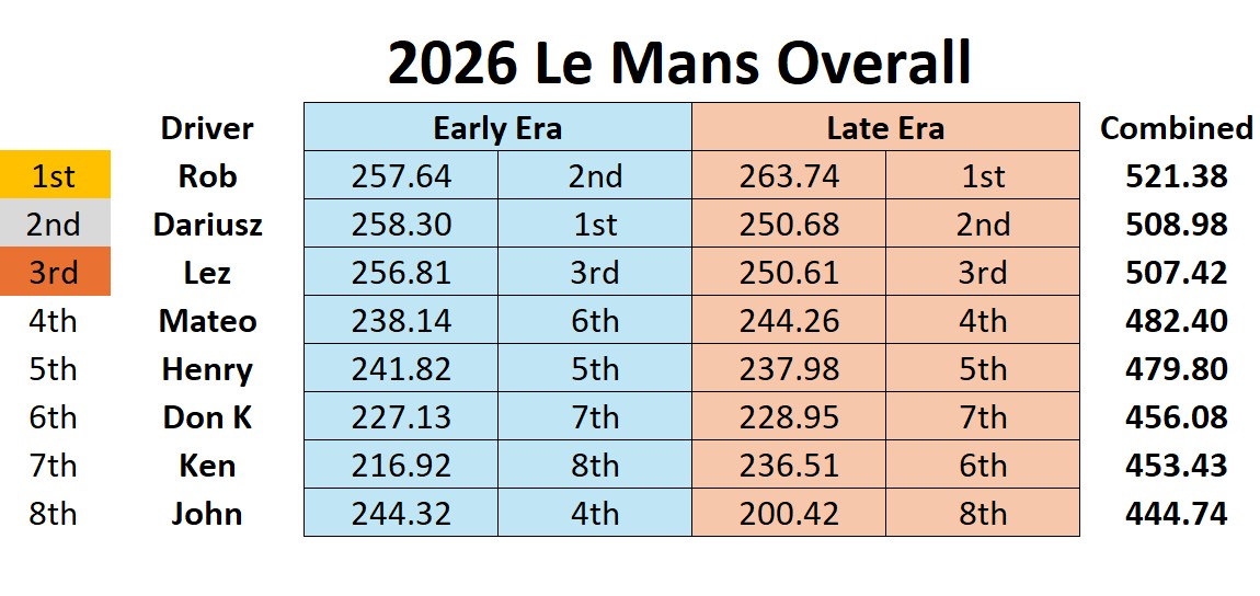 What a great time we all had running this year’s Le Mans! A lot of close racing throughout the day with many battles between racers. Overall combining the two era’s Rob finished first thanks to a really good run in the late era. Dariusz in second overall and Lez third overall battled all day and ended up only a lap and a half apart, it was just too close to call all the way! Team Mateo in fourth overall finished only two and a half laps ahead of fifth overall Henry. Don K in sixth only three laps in front of Ken in seventh. We did have a mechanical problem this year, John who was running very fast sitting in fourth after the early era had a guide wire break. The time to repair really cost him finishing in eight place. To note: The early era had the top three racers only a lap and a half apart while the late era had Lez and Dariusz finish seven segments apart!
